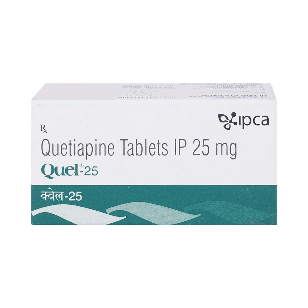 Quel 25mg Tablet is used in the treatment of schizophrenia (a mental disorder that can result in hallucinations or delusions and also adversely affects a person’s ability to think and behave) and mania. It is also used to treat bipolar disorders. Quel 25mg Tablet may be taken with or without food. However, it is advised to take it at the same time each day as this helps to maintain a consistent level of medicine in the body. Take this in the dose and duration as advised by your doctor and if you have missed a dose, take it as soon as you remember. It is important that this medication is not stopped suddenly without talking to your doctor as it may worsen your symptoms. However, discontinue this medicine immediately if you experience Neuroleptic malignant syndrome (NMS), characterized by fever, muscle rigidity, and altered consciousness or seizures.Some common side effects of this medicine include decreased hemoglobin levels in the blood, increased triglycerides level in blood, decreased cholesterol level in blood, headache, extrapyramidal symptoms, dry mouth, and withdrawal symptoms. Initially, this medicine may cause a sudden drop in blood pressure when you change positions, so it is better to rise slowly if you have been sitting or lying down. It also causes dizziness and sleepiness, so do not drive or do anything that requires mental focus until you know how this medicine affects you. This medicine may increase your weight but, modifying your lifestyle by having a healthy diet and exercising regularly can reduce this side effect.You should be cautious while using this medicine as it may increase the risk of developing diabetes, so it is better to monitor glucose regularly. Inform your doctor if you develop any unusual changes in mood or behavior, new or worsening depression, or suicidal thoughts while taking this medicine.