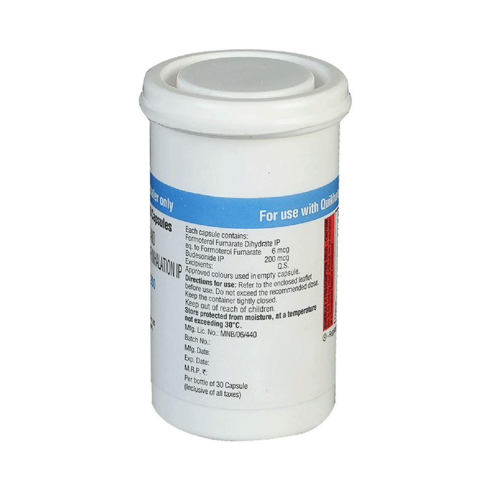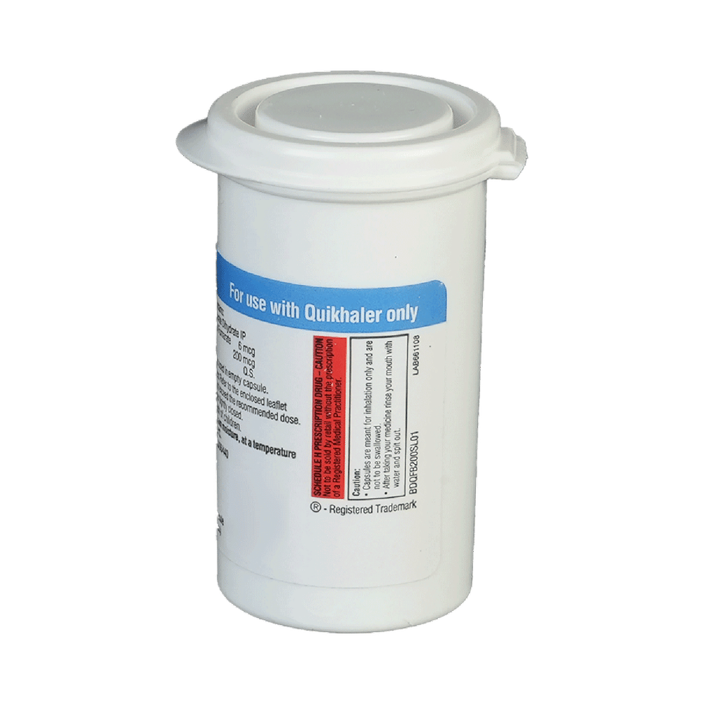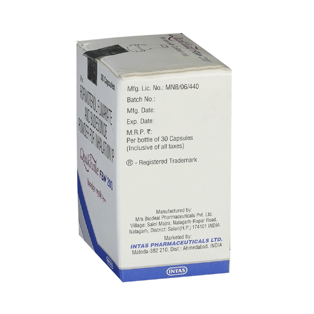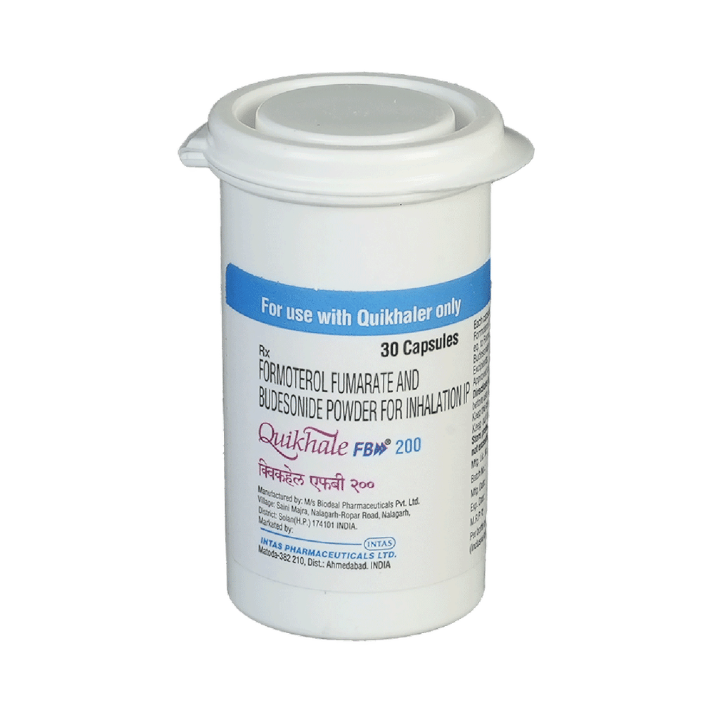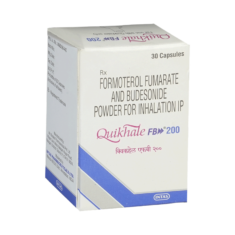 Quikhale FB 200 Capsule is a combination of two medicines in one inhaler. It relieves the long-term symptoms of asthma and COPD, making breathing easier. It works by inhibiting the release of certain chemical messengers that cause inflammation (swelling) and relaxes the muscles in the airways. Your doctor will tell you how often you need to use your inhaler. The effect of this medicine may be noticeable after a few days but will only reach its maximum after a few weeks. This medicine must be used regularly to be effective, so go on taking it even if you don't have any symptoms. That means it’s doing its job. If you stop taking it your symptoms may get worse. This medicine should not be used to relieve sudden shortness of breath. If sudden shortness of breath occurs, use your rescue inhaler. To get the benefit from this medicine you need to make sure you get your inhaler technique right, otherwise, it does not work as well.The most common side effects include headache, nausea, vomiting, stomach discomfort, and respiratory tract infection. If you get there, don’t stop taking it but do talk to your doctor. You can prevent some of these symptoms by rinsing your mouth and throat with water or brushing your teeth after using your inhaler. There are other, rarer side effects which can be serious. Talk to your doctor if you're worried about them.Before taking it, you should tell your doctor if you have any kidney or liver diseases so that your doctor can prescribe a suitable dose for you. You should also tell your doctor if you are pregnant, planning pregnancy or breastfeeding.