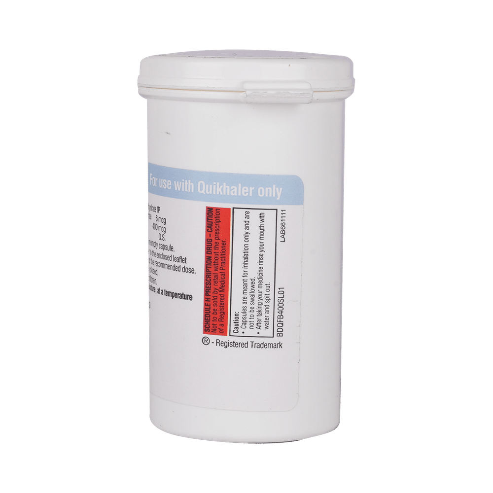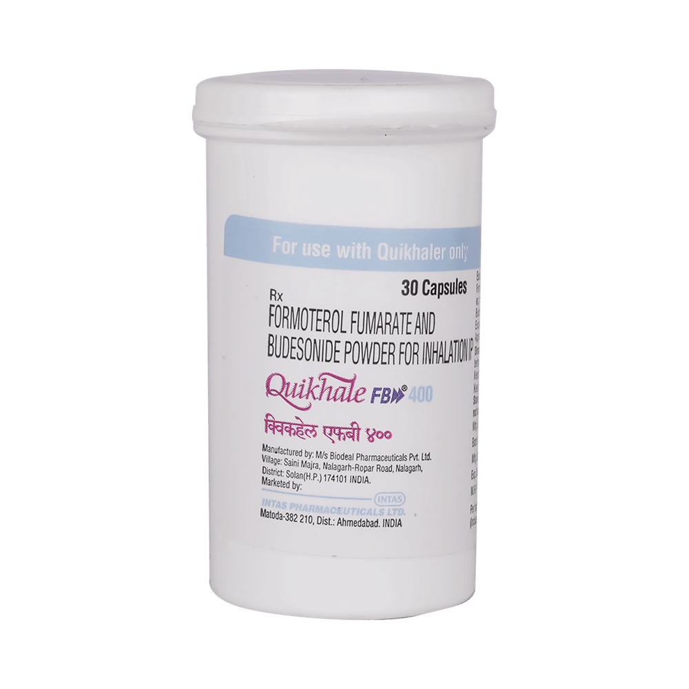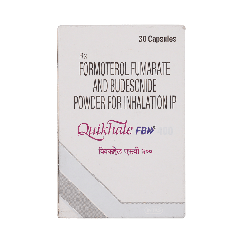 Quikhale FB 400 Capsule is a combination of two medicines in one inhaler. It relieves the long-term symptoms of asthma and COPD, making breathing easier. It works by inhibiting the release of certain chemical messengers that cause inflammation (swelling) and relaxes the muscles in the airways. Your doctor will tell you how often you need to use your inhaler. The effect of this medicine may be noticeable after a few days but will only reach its maximum after a few weeks. This medicine must be used regularly to be effective, so go on taking it even if you don't have any symptoms. That means it’s doing its job. If you stop taking it your symptoms may get worse. This medicine should not be used to relieve sudden shortness of breath. If sudden shortness of breath occurs, use your rescue inhaler. To get the benefit from this medicine you need to make sure you get your inhaler technique right, otherwise, it does not work as well.The most common side effects include headache, nausea, vomiting, stomach discomfort, and respiratory tract infection. If you get there, don’t stop taking it but do talk to your doctor. You can prevent some of these symptoms by rinsing your mouth and throat with water or brushing your teeth after using your inhaler. There are other, rarer side effects which can be serious. Talk to your doctor if you're worried about them.Before taking it, you should tell your doctor if you have any kidney or liver diseases so that your doctor can prescribe a suitable dose for you. You should also tell your doctor if you are pregnant, planning pregnancy or breastfeeding.