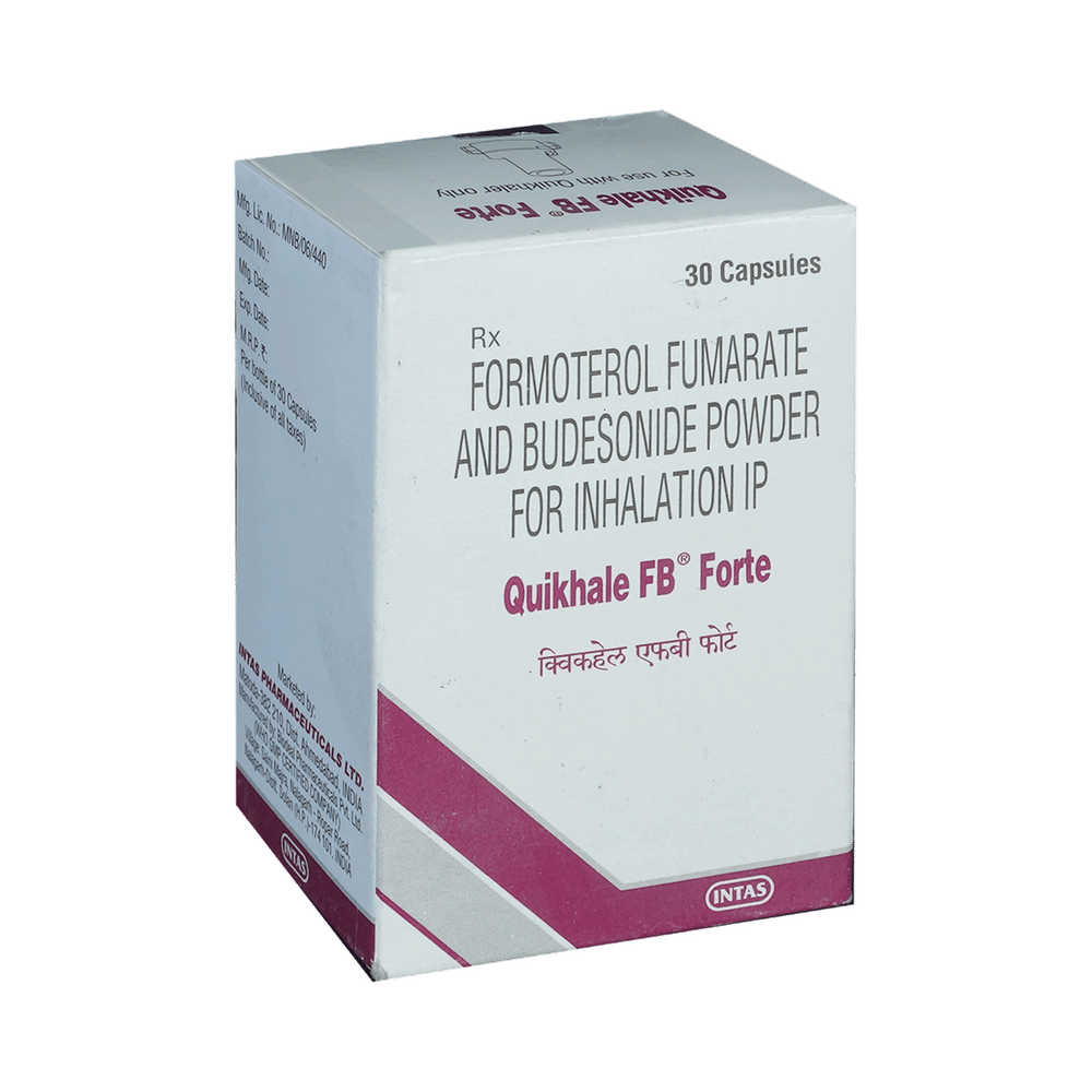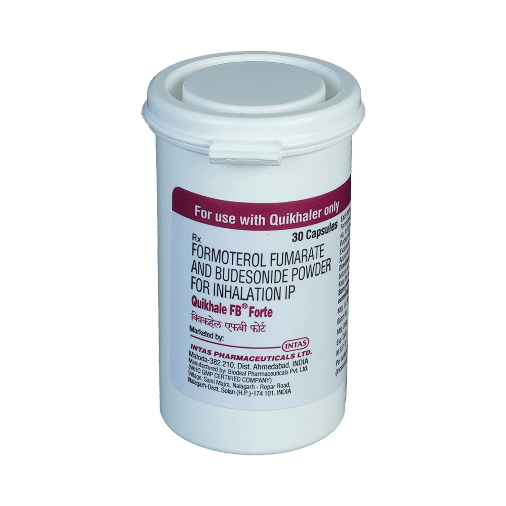 Quikhale FB Forte Rotacap is a combination of two medicines in one inhaler. It relieves the long-term symptoms of asthma and COPD, making breathing easier. It works by inhibiting the release of certain chemical messengers that cause inflammation (swelling) and relaxes the muscles in the airways. Your doctor will tell you how often you need to use your inhaler. The effect of this medicine may be noticeable after a few days but will only reach its maximum after a few weeks. This medicine must be used regularly to be effective, so go on taking it even if you don't have any symptoms. That means it’s doing its job. If you stop taking it your symptoms may get worse. This medicine should not be used to relieve sudden shortness of breath. If sudden shortness of breath occurs, use your rescue inhaler. To get the benefit from this medicine you need to make sure you get your inhaler technique right, otherwise, it does not work as well.The most common side effects include headache, nausea, vomiting, stomach discomfort, and respiratory tract infection. If you get there, don’t stop taking it but do talk to your doctor. You can prevent some of these symptoms by rinsing your mouth and throat with water or brushing your teeth after using your inhaler. There are other, rarer side effects which can be serious. Talk to your doctor if you're worried about them.Before taking it, you should tell your doctor if you have any kidney or liver diseases so that your doctor can prescribe a suitable dose for you. You should also tell your doctor if you are pregnant, planning pregnancy or breastfeeding.