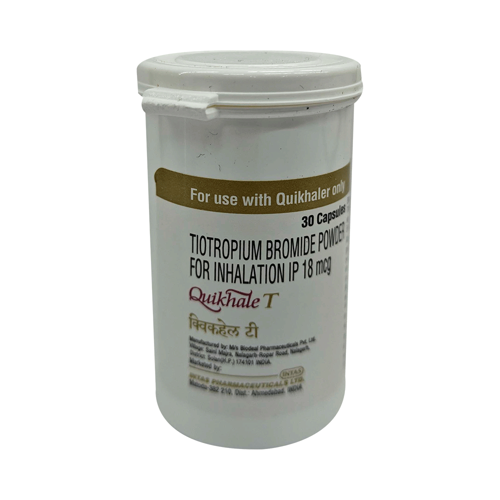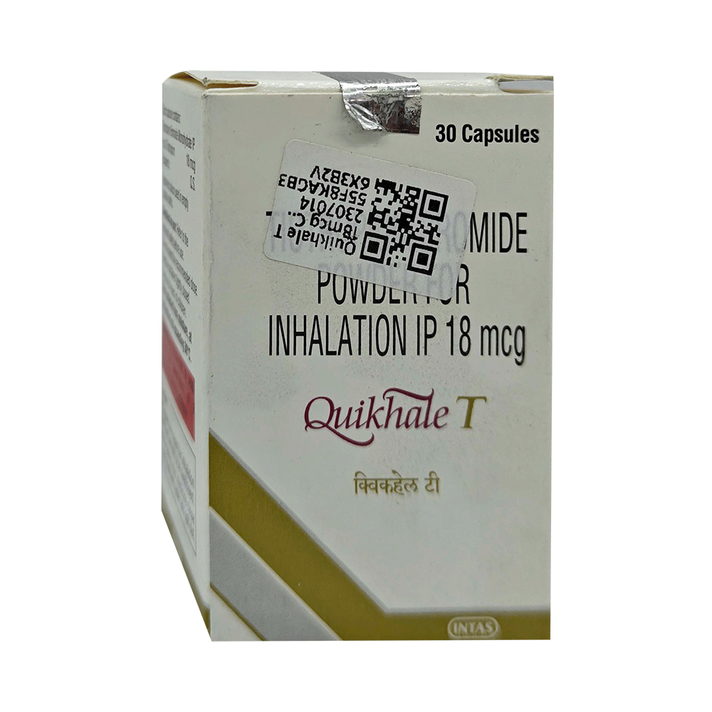 Quikhale T 18mcg Capsule is an anticholinergic medicine. It is used in the treatment of chronic obstructive pulmonary disease and asthma. It relaxes the airway muscles and makes it easier to breathe. This helps relieve symptoms such as chest tightness, shortness of breath, wheezing, and coughing. Quikhale T 18mcg Capsule is only for inhalational purpose, use it in the dose and duration as prescribed by your doctor. The first dose is given under medical supervision to prevent the side effects happen during first use. For better results, it is suggested to take it at the same time every day. The dose and how often you take it depends on what you are taking it for. Your doctor will decide how much you need to improve your symptoms. You should take this medicine for as long as it is prescribed for you. It does not prevent the already started breathing trouble or asthma attack, hence always carry your medical inhaler with you for an emergency.The most common side effect of this medicine is dry mouth. If these bother you or appear serious, let your doctor know. To overcome dry mouth, it is advised to increase water intake, carry sugar candy, or maintain good oral hygiene. If you experience any other side effects, let your doctor know.Before taking this medicine, let your doctor know if you have liver or kidney disease, or if you are pregnant or breastfeeding. Your doctor should also know about all other medicines you are taking as many of these may make this medicine less effective or change the way it works.