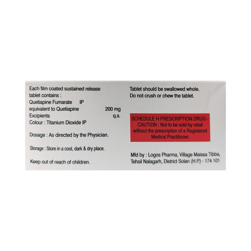 Quin 200 SR Tablet is used in the treatment of schizophrenia (a mental disorder that can result in hallucinations or delusions and also adversely affects a person’s ability to think and behave) and mania. It is also used to treat bipolar disorders. Quin 200 SR Tablet may be taken with or without food. However, it is advised to take it at the same time each day as this helps to maintain a consistent level of medicine in the body. Take this in the dose and duration as advised by your doctor and if you have missed a dose, take it as soon as you remember. It is important that this medication is not stopped suddenly without talking to your doctor as it may worsen your symptoms. However, discontinue this medicine immediately if you experience Neuroleptic malignant syndrome (NMS), characterized by fever, muscle rigidity, and altered consciousness or seizures.Some common side effects of this medicine include decreased hemoglobin levels in the blood, increased triglycerides level in blood, decreased cholesterol level in blood, headache, extrapyramidal symptoms, dry mouth, and withdrawal symptoms. Initially, this medicine may cause a sudden drop in blood pressure when you change positions, so it is better to rise slowly if you have been sitting or lying down. It also causes dizziness and sleepiness, so do not drive or do anything that requires mental focus until you know how this medicine affects you. This medicine may increase your weight but, modifying your lifestyle by having a healthy diet and exercising regularly can reduce this side effect.You should be cautious while using this medicine as it may increase the risk of developing diabetes, so it is better to monitor glucose regularly. Inform your doctor if you develop any unusual changes in mood or behavior, new or worsening depression, or suicidal thoughts while taking this medicine.