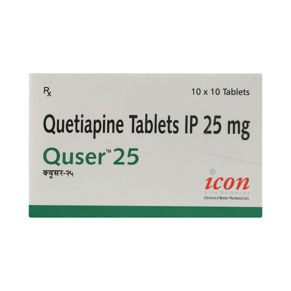 Quser 25mg Tablet is used in the treatment of schizophrenia (a mental disorder that can result in hallucinations or delusions and also adversely affects a person’s ability to think and behave) and mania. It is also used to treat bipolar disorders. Quser 25mg Tablet may be taken with or without food. However, it is advised to take it at the same time each day as this helps to maintain a consistent level of medicine in the body. Take this in the dose and duration as advised by your doctor and if you have missed a dose, take it as soon as you remember. It is important that this medication is not stopped suddenly without talking to your doctor as it may worsen your symptoms. However, discontinue this medicine immediately if you experience Neuroleptic malignant syndrome (NMS), characterized by fever, muscle rigidity, and altered consciousness or seizures.Some common side effects of this medicine include decreased hemoglobin levels in the blood, increased triglycerides level in blood, decreased cholesterol level in blood, headache, extrapyramidal symptoms, dry mouth, and withdrawal symptoms. Initially, this medicine may cause a sudden drop in blood pressure when you change positions, so it is better to rise slowly if you have been sitting or lying down. It also causes dizziness and sleepiness, so do not drive or do anything that requires mental focus until you know how this medicine affects you. This medicine may increase your weight but, modifying your lifestyle by having a healthy diet and exercising regularly can reduce this side effect.You should be cautious while using this medicine as it may increase the risk of developing diabetes, so it is better to monitor glucose regularly. Inform your doctor if you develop any unusual changes in mood or behavior, new or worsening depression, or suicidal thoughts while taking this medicine.