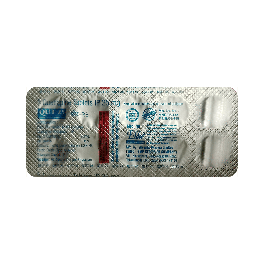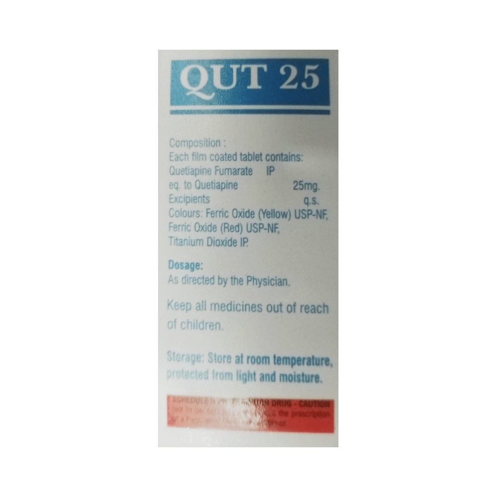 QUT 25 Tablet is used in the treatment of schizophrenia (a mental disorder that can result in hallucinations or delusions and also adversely affects a person’s ability to think and behave) and mania. It is also used to treat bipolar disorders. QUT 25 Tablet may be taken with or without food. However, it is advised to take it at the same time each day as this helps to maintain a consistent level of medicine in the body. Take this in the dose and duration as advised by your doctor and if you have missed a dose, take it as soon as you remember. It is important that this medication is not stopped suddenly without talking to your doctor as it may worsen your symptoms. However, discontinue this medicine immediately if you experience Neuroleptic malignant syndrome (NMS), characterized by fever, muscle rigidity, and altered consciousness or seizures.Some common side effects of this medicine include decreased hemoglobin levels in the blood, increased triglycerides level in blood, decreased cholesterol level in blood, headache, extrapyramidal symptoms, dry mouth, and withdrawal symptoms. Initially, this medicine may cause a sudden drop in blood pressure when you change positions, so it is better to rise slowly if you have been sitting or lying down. It also causes dizziness and sleepiness, so do not drive or do anything that requires mental focus until you know how this medicine affects you. This medicine may increase your weight but, modifying your lifestyle by having a healthy diet and exercising regularly can reduce this side effect.You should be cautious while using this medicine as it may increase the risk of developing diabetes, so it is better to monitor glucose regularly. Inform your doctor if you develop any unusual changes in mood or behavior, new or worsening depression, or suicidal thoughts while taking this medicine.