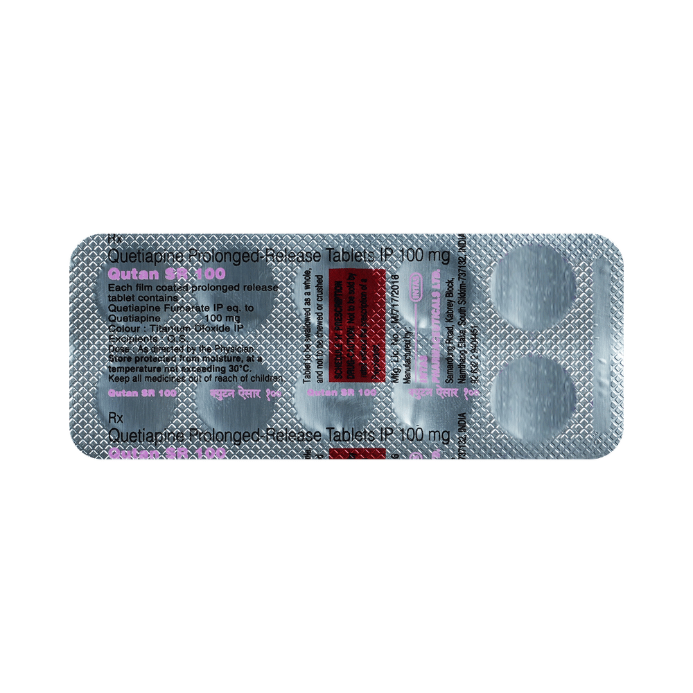 QUtan SR 100 Tablet is used in the treatment of schizophrenia (a mental disorder that can result in hallucinations or delusions and also adversely affects a person’s ability to think and behave) and mania. It is also used to treat bipolar disorders. QUtan SR 100 Tablet may be taken with or without food. However, it is advised to take it at the same time each day as this helps to maintain a consistent level of medicine in the body. Take this in the dose and duration as advised by your doctor and if you have missed a dose, take it as soon as you remember. It is important that this medication is not stopped suddenly without talking to your doctor as it may worsen your symptoms. However, discontinue this medicine immediately if you experience Neuroleptic malignant syndrome (NMS), characterized by fever, muscle rigidity, and altered consciousness or seizures.Some common side effects of this medicine include decreased hemoglobin levels in the blood, increased triglycerides level in blood, decreased cholesterol level in blood, headache, extrapyramidal symptoms, dry mouth, and withdrawal symptoms. Initially, this medicine may cause a sudden drop in blood pressure when you change positions, so it is better to rise slowly if you have been sitting or lying down. It also causes dizziness and sleepiness, so do not drive or do anything that requires mental focus until you know how this medicine affects you. This medicine may increase your weight but, modifying your lifestyle by having a healthy diet and exercising regularly can reduce this side effect.You should be cautious while using this medicine as it may increase the risk of developing diabetes, so it is better to monitor glucose regularly. Inform your doctor if you develop any unusual changes in mood or behavior, new or worsening depression, or suicidal thoughts while taking this medicine.