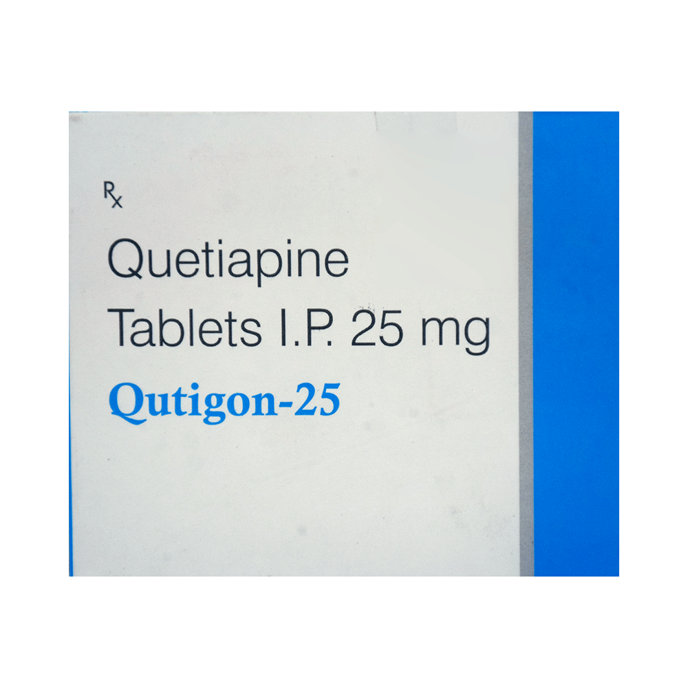 Qutigon 25 Tablet is used in the treatment of schizophrenia (a mental disorder that can result in hallucinations or delusions and also adversely affects a person’s ability to think and behave) and mania. It is also used to treat bipolar disorders. Qutigon 25 Tablet may be taken with or without food. However, it is advised to take it at the same time each day as this helps to maintain a consistent level of medicine in the body. Take this in the dose and duration as advised by your doctor and if you have missed a dose, take it as soon as you remember. It is important that this medication is not stopped suddenly without talking to your doctor as it may worsen your symptoms. However, discontinue this medicine immediately if you experience Neuroleptic malignant syndrome (NMS), characterized by fever, muscle rigidity, and altered consciousness or seizures.Some common side effects of this medicine include decreased hemoglobin levels in the blood, increased triglycerides level in blood, decreased cholesterol level in blood, headache, extrapyramidal symptoms, dry mouth, and withdrawal symptoms. Initially, this medicine may cause a sudden drop in blood pressure when you change positions, so it is better to rise slowly if you have been sitting or lying down. It also causes dizziness and sleepiness, so do not drive or do anything that requires mental focus until you know how this medicine affects you. This medicine may increase your weight but, modifying your lifestyle by having a healthy diet and exercising regularly can reduce this side effect.You should be cautious while using this medicine as it may increase the risk of developing diabetes, so it is better to monitor glucose regularly. Inform your doctor if you develop any unusual changes in mood or behavior, new or worsening depression, or suicidal thoughts while taking this medicine.