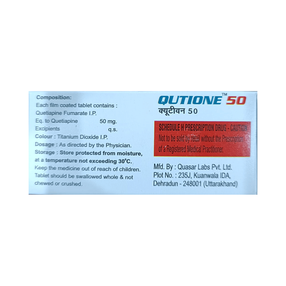 Qutione 50 Tablet is used in the treatment of schizophrenia (a mental disorder that can result in hallucinations or delusions and also adversely affects a person’s ability to think and behave) and mania. It is also used to treat bipolar disorders. Qutione 50 Tablet may be taken with or without food. However, it is advised to take it at the same time each day as this helps to maintain a consistent level of medicine in the body. Take this in the dose and duration as advised by your doctor and if you have missed a dose, take it as soon as you remember. It is important that this medication is not stopped suddenly without talking to your doctor as it may worsen your symptoms. However, discontinue this medicine immediately if you experience Neuroleptic malignant syndrome (NMS), characterized by fever, muscle rigidity, and altered consciousness or seizures.Some common side effects of this medicine include decreased hemoglobin levels in the blood, increased triglycerides level in blood, decreased cholesterol level in blood, headache, extrapyramidal symptoms, dry mouth, and withdrawal symptoms. Initially, this medicine may cause a sudden drop in blood pressure when you change positions, so it is better to rise slowly if you have been sitting or lying down. It also causes dizziness and sleepiness, so do not drive or do anything that requires mental focus until you know how this medicine affects you. This medicine may increase your weight but, modifying your lifestyle by having a healthy diet and exercising regularly can reduce this side effect.You should be cautious while using this medicine as it may increase the risk of developing diabetes, so it is better to monitor glucose regularly. Inform your doctor if you develop any unusual changes in mood or behavior, new or worsening depression, or suicidal thoughts while taking this medicine.
