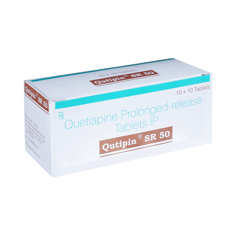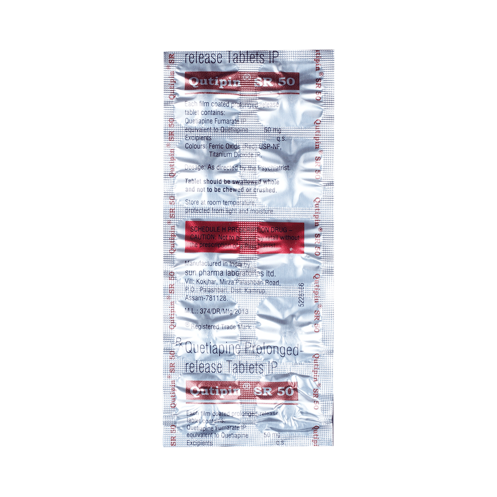 Qutipin SR 50 Tablet is used in the treatment of schizophrenia (a mental disorder that can result in hallucinations or delusions and also adversely affects a person’s ability to think and behave) and mania. It is also used to treat bipolar disorders. Qutipin SR 50 Tablet may be taken with or without food. However, it is advised to take it at the same time each day as this helps to maintain a consistent level of medicine in the body. Take this in the dose and duration as advised by your doctor and if you have missed a dose, take it as soon as you remember. It is important that this medication is not stopped suddenly without talking to your doctor as it may worsen your symptoms. However, discontinue this medicine immediately if you experience Neuroleptic malignant syndrome (NMS), characterized by fever, muscle rigidity, and altered consciousness or seizures.Some common side effects of this medicine include decreased hemoglobin levels in the blood, increased triglycerides level in blood, decreased cholesterol level in blood, headache, extrapyramidal symptoms, dry mouth, and withdrawal symptoms. Initially, this medicine may cause a sudden drop in blood pressure when you change positions, so it is better to rise slowly if you have been sitting or lying down. It also causes dizziness and sleepiness, so do not drive or do anything that requires mental focus until you know how this medicine affects you. This medicine may increase your weight but, modifying your lifestyle by having a healthy diet and exercising regularly can reduce this side effect.You should be cautious while using this medicine as it may increase the risk of developing diabetes, so it is better to monitor glucose regularly. Inform your doctor if you develop any unusual changes in mood or behavior, new or worsening depression, or suicidal thoughts while taking this medicine.