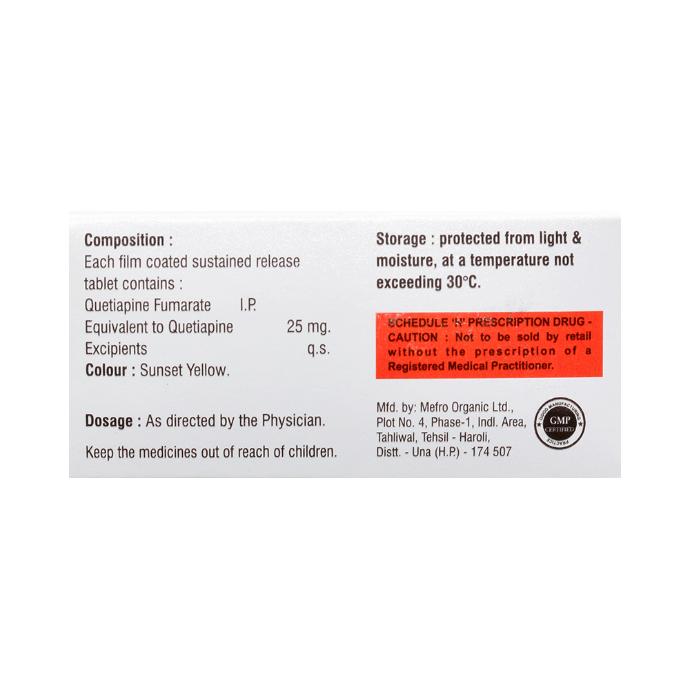 Qutiset 25 Tablet SR is used in the treatment of schizophrenia (a mental disorder that can result in hallucinations or delusions and also adversely affects a person’s ability to think and behave) and mania. It is also used to treat bipolar disorders. Qutiset 25 Tablet SR may be taken with or without food. However, it is advised to take it at the same time each day as this helps to maintain a consistent level of medicine in the body. Take this in the dose and duration as advised by your doctor and if you have missed a dose, take it as soon as you remember. It is important that this medication is not stopped suddenly without talking to your doctor as it may worsen your symptoms. However, discontinue this medicine immediately if you experience Neuroleptic malignant syndrome (NMS), characterized by fever, muscle rigidity, and altered consciousness or seizures.Some common side effects of this medicine include decreased hemoglobin levels in the blood, increased triglycerides level in blood, decreased cholesterol level in blood, headache, extrapyramidal symptoms, dry mouth, and withdrawal symptoms. Initially, this medicine may cause a sudden drop in blood pressure when you change positions, so it is better to rise slowly if you have been sitting or lying down. It also causes dizziness and sleepiness, so do not drive or do anything that requires mental focus until you know how this medicine affects you. This medicine may increase your weight but, modifying your lifestyle by having a healthy diet and exercising regularly can reduce this side effect.You should be cautious while using this medicine as it may increase the risk of developing diabetes, so it is better to monitor glucose regularly. Inform your doctor if you develop any unusual changes in mood or behavior, new or worsening depression, or suicidal thoughts while taking this medicine.