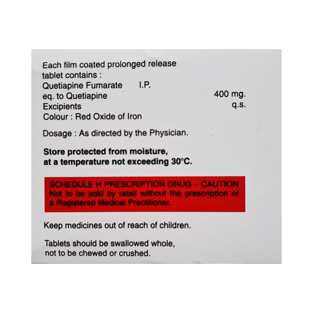 Qutistrom 400 PR Tablet is used in the treatment of schizophrenia (a mental disorder that can result in hallucinations or delusions and also adversely affects a person’s ability to think and behave) and mania. It is also used to treat bipolar disorders. Qutistrom 400 PR Tablet may be taken with or without food. However, it is advised to take it at the same time each day as this helps to maintain a consistent level of medicine in the body. Take this in the dose and duration as advised by your doctor and if you have missed a dose, take it as soon as you remember. It is important that this medication is not stopped suddenly without talking to your doctor as it may worsen your symptoms. However, discontinue this medicine immediately if you experience Neuroleptic malignant syndrome (NMS), characterized by fever, muscle rigidity, and altered consciousness or seizures.Some common side effects of this medicine include decreased hemoglobin levels in the blood, increased triglycerides level in blood, decreased cholesterol level in blood, headache, extrapyramidal symptoms, dry mouth, and withdrawal symptoms. Initially, this medicine may cause a sudden drop in blood pressure when you change positions, so it is better to rise slowly if you have been sitting or lying down. It also causes dizziness and sleepiness, so do not drive or do anything that requires mental focus until you know how this medicine affects you. This medicine may increase your weight but, modifying your lifestyle by having a healthy diet and exercising regularly can reduce this side effect.You should be cautious while using this medicine as it may increase the risk of developing diabetes, so it is better to monitor glucose regularly. Inform your doctor if you develop any unusual changes in mood or behavior, new or worsening depression, or suicidal thoughts while taking this medicine.