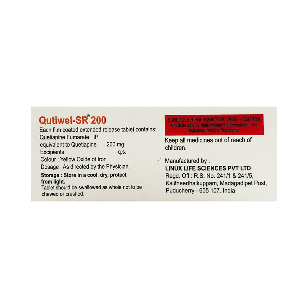 QUTIwel 200mg Tablet SR is used in the treatment of schizophrenia (a mental disorder that can result in hallucinations or delusions and also adversely affects a person’s ability to think and behave) and mania. It is also used to treat bipolar disorders. QUTIwel 200mg Tablet SR may be taken with or without food. However, it is advised to take it at the same time each day as this helps to maintain a consistent level of medicine in the body. Take this in the dose and duration as advised by your doctor and if you have missed a dose, take it as soon as you remember. It is important that this medication is not stopped suddenly without talking to your doctor as it may worsen your symptoms. However, discontinue this medicine immediately if you experience Neuroleptic malignant syndrome (NMS), characterized by fever, muscle rigidity, and altered consciousness or seizures.Some common side effects of this medicine include decreased hemoglobin levels in the blood, increased triglycerides level in blood, decreased cholesterol level in blood, headache, extrapyramidal symptoms, dry mouth, and withdrawal symptoms. Initially, this medicine may cause a sudden drop in blood pressure when you change positions, so it is better to rise slowly if you have been sitting or lying down. It also causes dizziness and sleepiness, so do not drive or do anything that requires mental focus until you know how this medicine affects you. This medicine may increase your weight but, modifying your lifestyle by having a healthy diet and exercising regularly can reduce this side effect.You should be cautious while using this medicine as it may increase the risk of developing diabetes, so it is better to monitor glucose regularly. Inform your doctor if you develop any unusual changes in mood or behavior, new or worsening depression, or suicidal thoughts while taking this medicine.