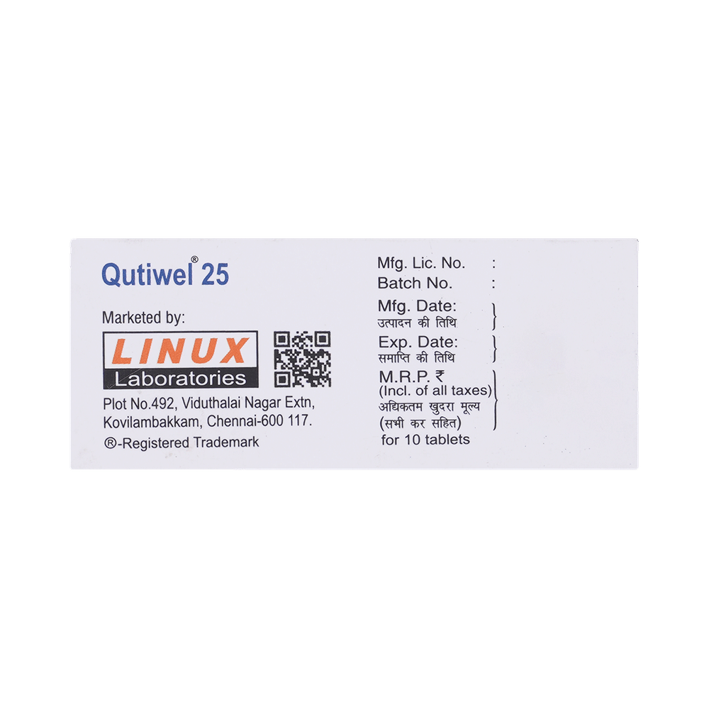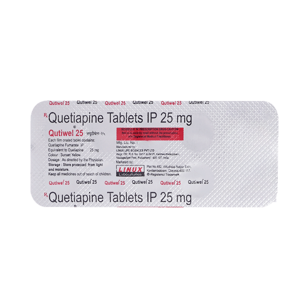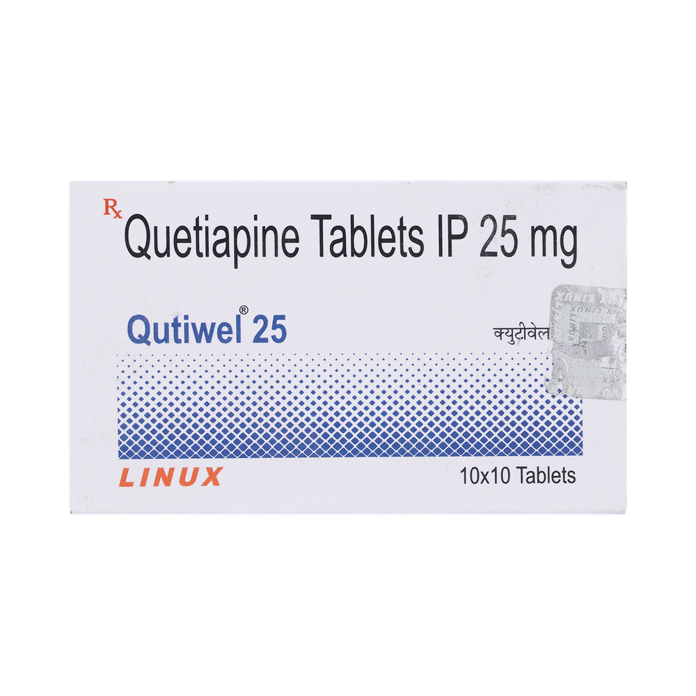 QUTIwel 25mg Tablet is used in the treatment of schizophrenia (a mental disorder that can result in hallucinations or delusions and also adversely affects a person’s ability to think and behave) and mania. It is also used to treat bipolar disorders. QUTIwel 25mg Tablet may be taken with or without food. However, it is advised to take it at the same time each day as this helps to maintain a consistent level of medicine in the body. Take this in the dose and duration as advised by your doctor and if you have missed a dose, take it as soon as you remember. It is important that this medication is not stopped suddenly without talking to your doctor as it may worsen your symptoms. However, discontinue this medicine immediately if you experience Neuroleptic malignant syndrome (NMS), characterized by fever, muscle rigidity, and altered consciousness or seizures.Some common side effects of this medicine include decreased hemoglobin levels in the blood, increased triglycerides level in blood, decreased cholesterol level in blood, headache, extrapyramidal symptoms, dry mouth, and withdrawal symptoms. Initially, this medicine may cause a sudden drop in blood pressure when you change positions, so it is better to rise slowly if you have been sitting or lying down. It also causes dizziness and sleepiness, so do not drive or do anything that requires mental focus until you know how this medicine affects you. This medicine may increase your weight but, modifying your lifestyle by having a healthy diet and exercising regularly can reduce this side effect.You should be cautious while using this medicine as it may increase the risk of developing diabetes, so it is better to monitor glucose regularly. Inform your doctor if you develop any unusual changes in mood or behavior, new or worsening depression, or suicidal thoughts while taking this medicine.