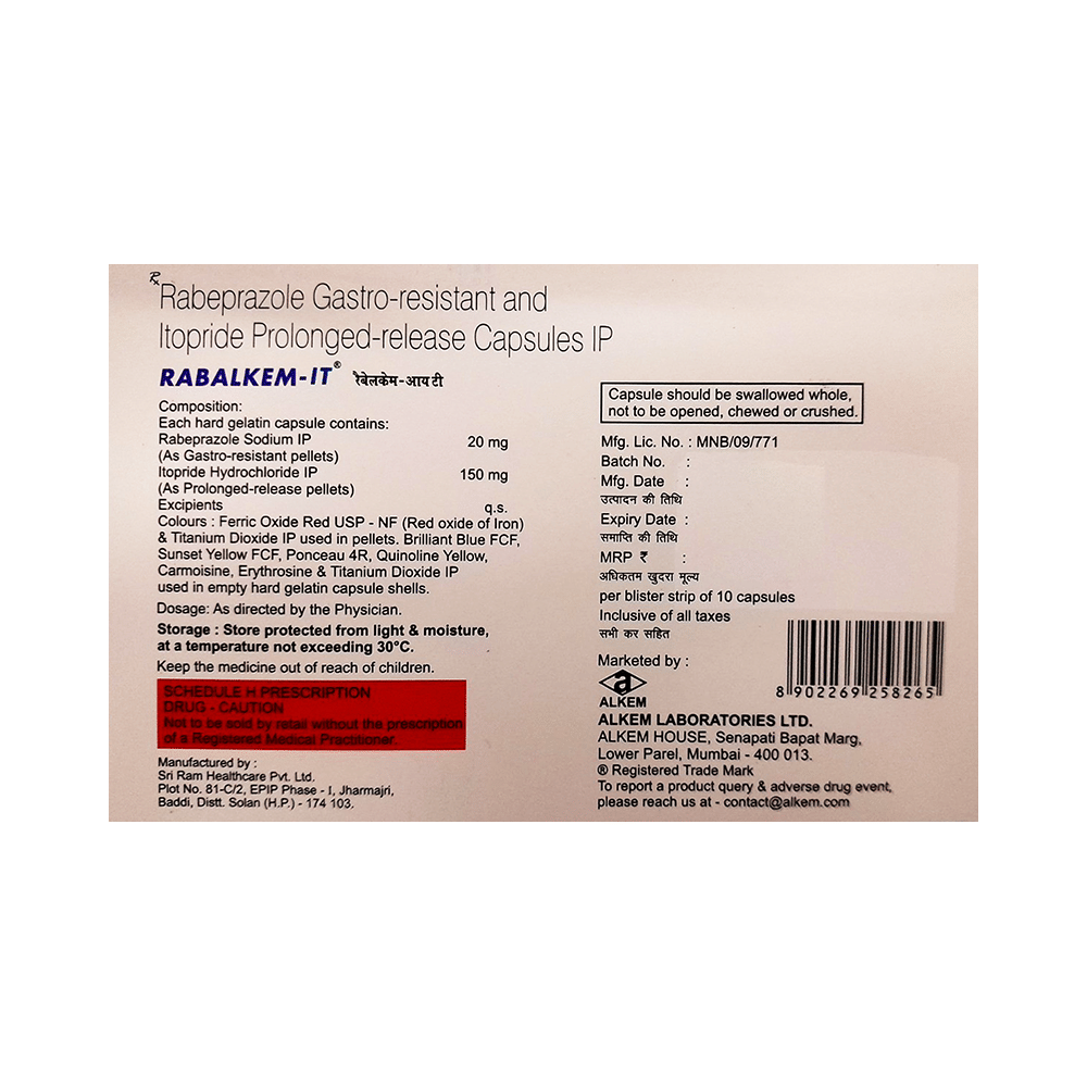 Rabalkem IT 20mg/150mg Capsule is a combination of two medicines: Rabeprazole and Itopride. Rabeprazole is a proton pump inhibitor (PPI). It works by reducing the amount of acid in the stomach which helps in the relief of acid-related indigestion and heartburn. Itopride is a prokinetic which works on the region in the brain that controls vomiting. It also acts on the upper digestive tract to increase the movement of the stomach and intestines, allowing food to move more easily through the stomach.