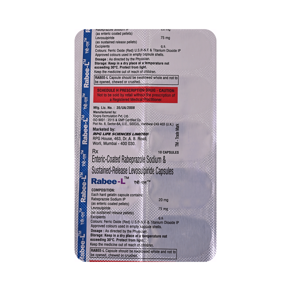 Rabee-L 75mg/20mg Capsule SR is a prescription medicine which is used in the treatment of gastroesophageal reflux disease (acid reflux), intestinal ulcers, and irritable bowel syndrome. It reduces excess acid production in the stomach and prevents the reflux of stomach acid into the food pipe. Rabee-L 75mg/20mg Capsule SR is taken with or without food in a dose and duration as advised by the doctor. The dose you are given will depend on your condition and how you respond to the medicine. You should keep taking this medicine for as long as your doctor recommends. If you stop treatment too early your symptoms may come back and your condition may worsen. Let your healthcare team know about all other medications you are taking as some may affect, or be affected by this medicine.The most common side effects are nausea, stomach pain, diarrhea, flatulence, constipation, headache, weakness, and flu-like symptoms. Most of these are temporary and usually resolve with time. Contact your doctor straight away if you are at all concerned about any of these side effects. It may also cause dizziness and sleepiness, so do not drive or do anything that requires mental focus until you know how this medicine affects you. Avoid drinking alcohol while taking this medicine as it can worsen your sleepiness.Lifestyle modifications like having fiber-rich diet, avoiding foods that trigger your symptoms, increasing fluid intake and regular exercise can help you to get better results. Before taking it, you should tell your doctor if you have any kidney or liver diseases. You should also tell your doctor if you are pregnant, planning pregnancy or breastfeeding.