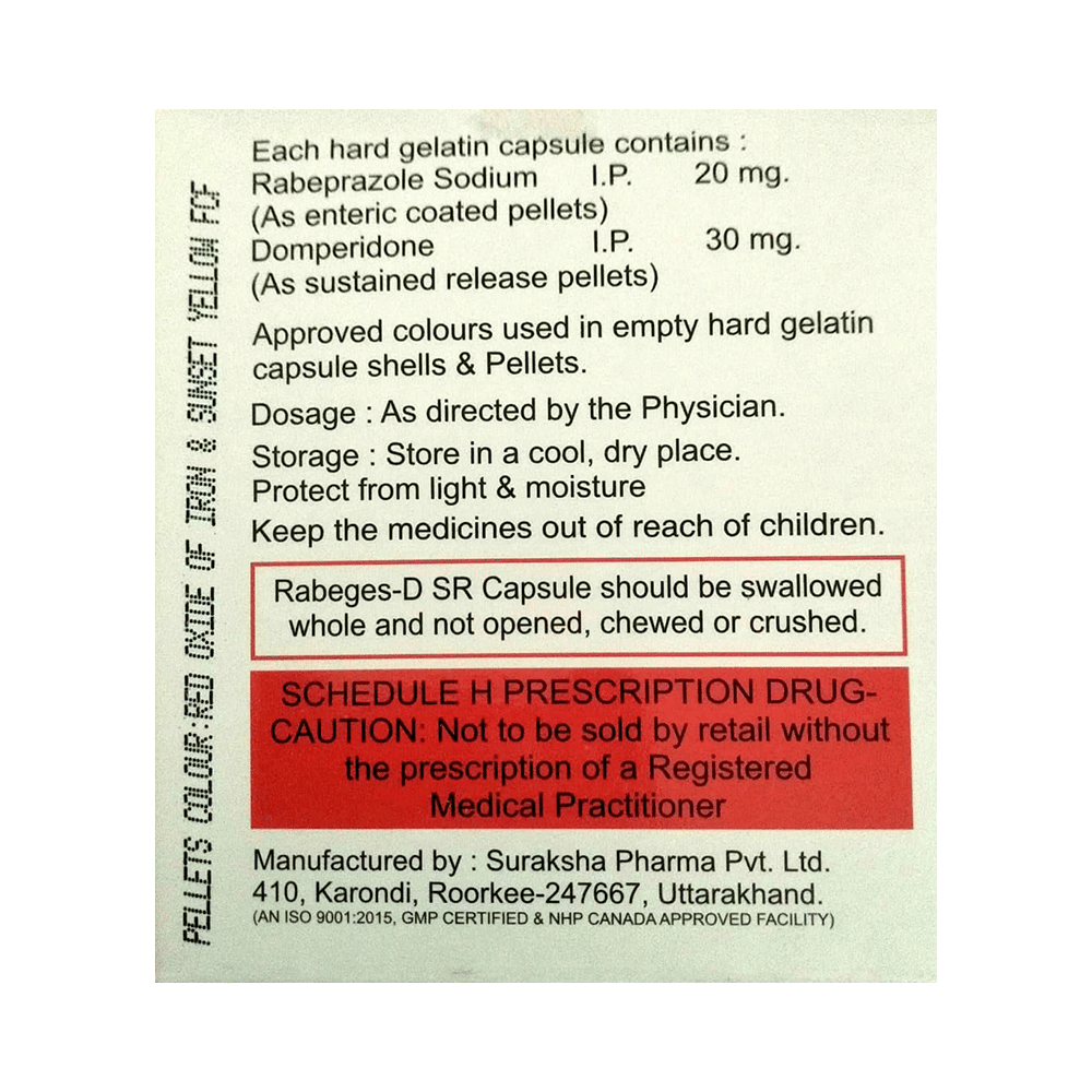 In Treatment of Gastroesophageal reflux disease (Acid reflux)Gastroesophageal reflux disease (GERD) is a chronic (long-term) condition in which there is an excess production of acid in the stomach. Rabeges-D SR Capsule reduces the amount of acid your stomach makes and relieves the pain associated with heartburn and acid reflux. You should take it exactly as it is prescribed for it to be effective. Some simple lifestyle changes can help reduce the symptoms of GERD. Think about what foods trigger heartburn and try to avoid them; eat smaller, more frequent meals; try to lose weight if you are overweight, and try to find ways to relax. Do not eat within 3-4 hours of going to bed.In Treatment of Peptic ulcer diseasePeptic ulcer disease is a condition in which painful sores or ulcers develop in the inner lining of the stomach or gut (intestine). Rabeges-D SR Capsule reduces the amount of acid your stomach makes which prevents further damage to the ulcer as it heals naturally. You may be given other medicines along with this medicine depending on what caused the ulcer. You need to keep taking the medicine as it is prescribed for it to be effective, even if the symptoms seem to disappear.show moreshow less