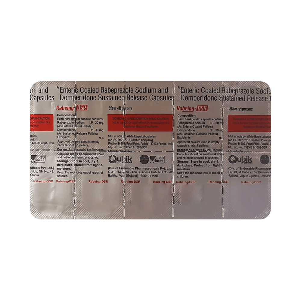 Rabeing-DSR Capsule is a combination medicine used to treat gastroesophageal reflux disease (acid reflux). It works by relieving the symptoms of acidity such as heartburn, stomach pain, or irritation. It also neutralizes the acid and promotes easy passage of gas to reduce stomach discomfort. Rabeing-DSR Capsule is taken without food in a dose and duration as advised by the doctor. The dose you are given will depend on your condition and how you respond to the medicine. You should keep taking this medicine for as long as your doctor recommends. If you stop treatment too early your symptoms may come back and your condition may worsen. Let your healthcare team know about all other medications you are taking as some may affect, or be affected by this medicine.The most common side effects are diarrhea, stomach pain, dryness in the mouth, headache, flatulence, and weakness. Most of these are temporary and usually resolve with time. Contact your doctor straight away if you are at all concerned about any of these side effects. This medicine may cause dizziness and sleepiness, so do not drive or do anything that requires mental focus until you know how this medicine affects you. Avoid drinking alcohol while taking this medicine as it can worsen your sleepiness. Lifestyle modifications like having cold milk and avoiding hot tea, coffee, spicy food or chocolate can help you to get better results.Before you start taking this medicine it is important to inform your doctor if you are suffering from kidney or liver disease. You should also tell your doctor if you are pregnant, planning pregnancy or breastfeeding.