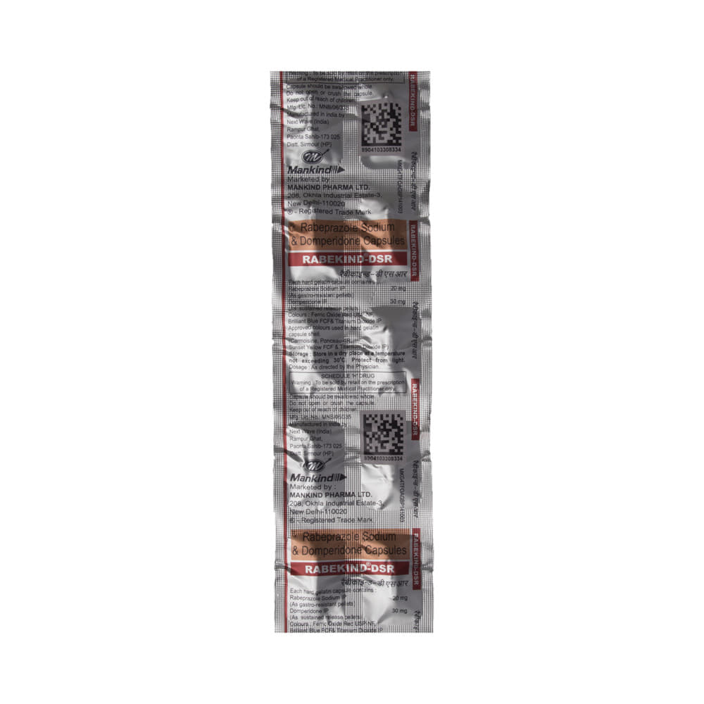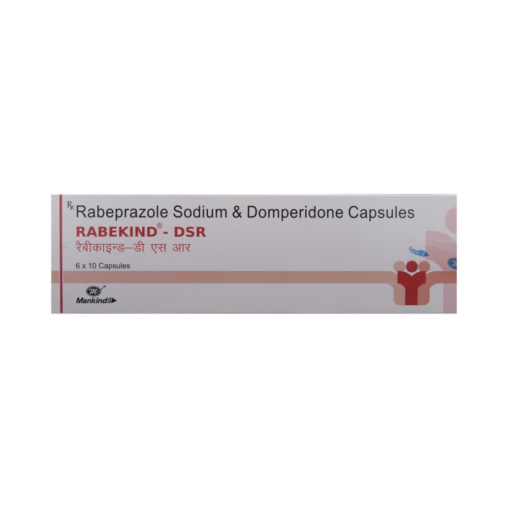 Rabekind-DSR Capsule is a combination medicine used to treat gastroesophageal reflux disease (acid reflux). It works by relieving the symptoms of acidity such as heartburn, stomach pain, or irritation. It also neutralizes the acid and promotes easy passage of gas to reduce stomach discomfort. Rabekind-DSR Capsule is taken without food in a dose and duration as advised by the doctor. The dose you are given will depend on your condition and how you respond to the medicine. You should keep taking this medicine for as long as your doctor recommends. If you stop treatment too early your symptoms may come back and your condition may worsen. Let your healthcare team know about all other medications you are taking as some may affect, or be affected by this medicine.The most common side effects are diarrhea, stomach pain, dryness in the mouth, headache, flatulence, and weakness. Most of these are temporary and usually resolve with time. Contact your doctor straight away if you are at all concerned about any of these side effects. This medicine may cause dizziness and sleepiness, so do not drive or do anything that requires mental focus until you know how this medicine affects you. Avoid drinking alcohol while taking this medicine as it can worsen your sleepiness. Lifestyle modifications like having cold milk and avoiding hot tea, coffee, spicy food or chocolate can help you to get better results.Before you start taking this medicine it is important to inform your doctor if you are suffering from kidney or liver disease. You should also tell your doctor if you are pregnant, planning pregnancy or breastfeeding.