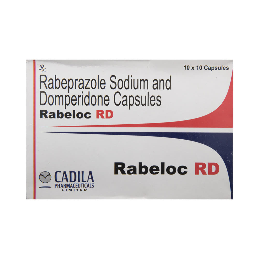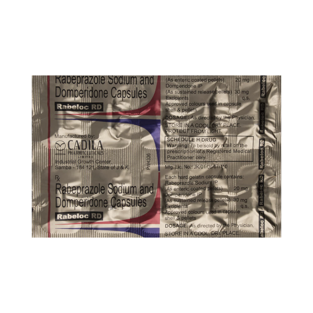 Rabeloc RD Capsule is a combination medicine used to treat gastroesophageal reflux disease (acid reflux). It works by relieving the symptoms of acidity such as heartburn, stomach pain, or irritation. It also neutralizes the acid and promotes easy passage of gas to reduce stomach discomfort. Rabeloc RD Capsule is taken without food in a dose and duration as advised by the doctor. The dose you are given will depend on your condition and how you respond to the medicine. You should keep taking this medicine for as long as your doctor recommends. If you stop treatment too early your symptoms may come back and your condition may worsen. Let your healthcare team know about all other medications you are taking as some may affect, or be affected by this medicine.The most common side effects are diarrhea, stomach pain, dryness in the mouth, headache, flatulence, and weakness. Most of these are temporary and usually resolve with time. Contact your doctor straight away if you are at all concerned about any of these side effects. This medicine may cause dizziness and sleepiness, so do not drive or do anything that requires mental focus until you know how this medicine affects you. Avoid drinking alcohol while taking this medicine as it can worsen your sleepiness. Lifestyle modifications like having cold milk and avoiding hot tea, coffee, spicy food or chocolate can help you to get better results.Before you start taking this medicine it is important to inform your doctor if you are suffering from kidney or liver disease. You should also tell your doctor if you are pregnant, planning pregnancy or breastfeeding.