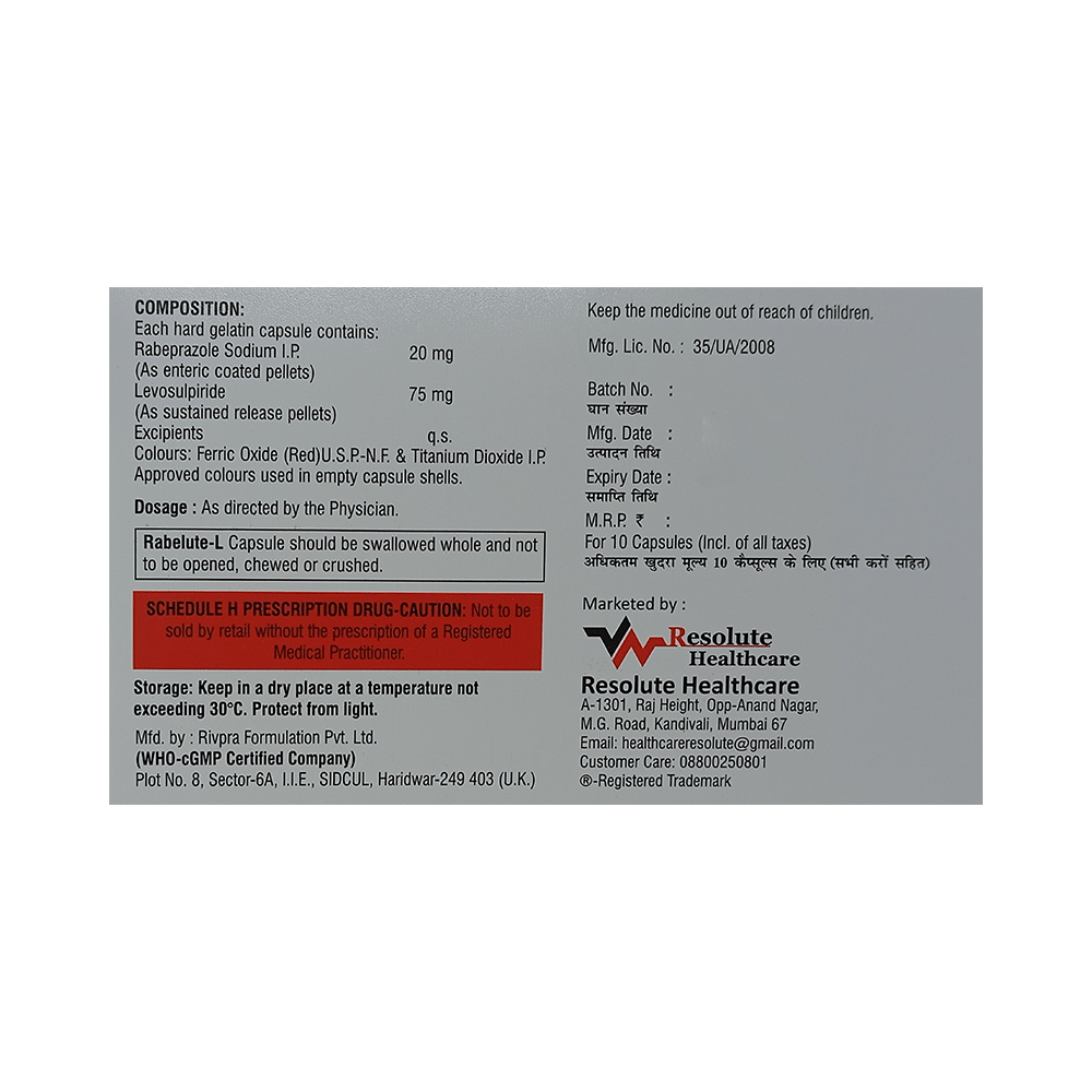 Rabelute-L Capsule SR is a prescription medicine which is used in the treatment of gastroesophageal reflux disease (acid reflux), intestinal ulcers, and irritable bowel syndrome. It reduces excess acid production in the stomach and prevents the reflux of stomach acid into the food pipe. Rabelute-L Capsule SR is taken with or without food in a dose and duration as advised by the doctor. The dose you are given will depend on your condition and how you respond to the medicine. You should keep taking this medicine for as long as your doctor recommends. If you stop treatment too early your symptoms may come back and your condition may worsen. Let your healthcare team know about all other medications you are taking as some may affect, or be affected by this medicine.The most common side effects are nausea, stomach pain, diarrhea, flatulence, constipation, headache, weakness, and flu-like symptoms. Most of these are temporary and usually resolve with time. Contact your doctor straight away if you are at all concerned about any of these side effects. It may also cause dizziness and sleepiness, so do not drive or do anything that requires mental focus until you know how this medicine affects you. Avoid drinking alcohol while taking this medicine as it can worsen your sleepiness.Lifestyle modifications like having fiber-rich diet, avoiding foods that trigger your symptoms, increasing fluid intake and regular exercise can help you to get better results. Before taking it, you should tell your doctor if you have any kidney or liver diseases. You should also tell your doctor if you are pregnant, planning pregnancy or breastfeeding.