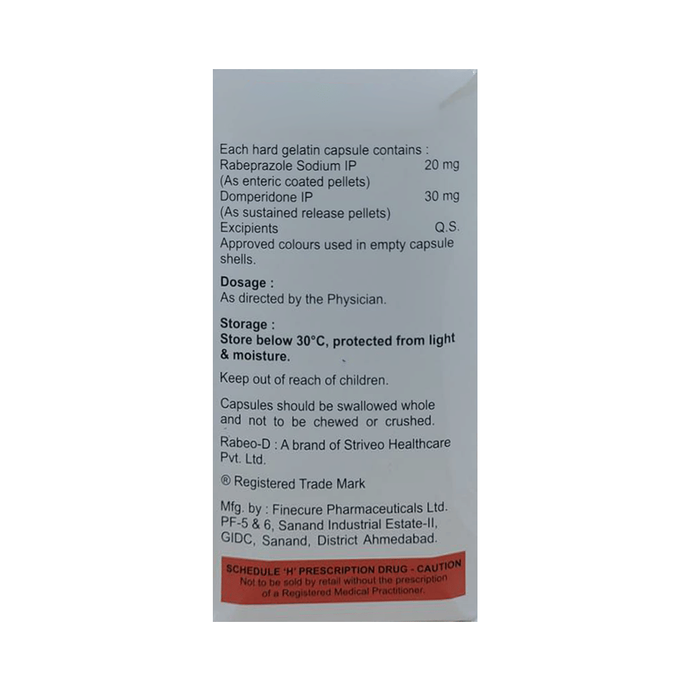 Rabeo-D Capsule SR is a combination medicine used to treat gastroesophageal reflux disease (acid reflux). It works by relieving the symptoms of acidity such as heartburn, stomach pain, or irritation. It also neutralizes the acid and promotes easy passage of gas to reduce stomach discomfort. Rabeo-D Capsule SR is taken without food in a dose and duration as advised by the doctor. The dose you are given will depend on your condition and how you respond to the medicine. You should keep taking this medicine for as long as your doctor recommends. If you stop treatment too early your symptoms may come back and your condition may worsen. Let your healthcare team know about all other medications you are taking as some may affect, or be affected by this medicine.The most common side effects are diarrhea, stomach pain, dryness in the mouth, headache, flatulence, and weakness. Most of these are temporary and usually resolve with time. Contact your doctor straight away if you are at all concerned about any of these side effects. This medicine may cause dizziness and sleepiness, so do not drive or do anything that requires mental focus until you know how this medicine affects you. Avoid drinking alcohol while taking this medicine as it can worsen your sleepiness. Lifestyle modifications like having cold milk and avoiding hot tea, coffee, spicy food or chocolate can help you to get better results.Before you start taking this medicine it is important to inform your doctor if you are suffering from kidney or liver disease. You should also tell your doctor if you are pregnant, planning pregnancy or breastfeeding.