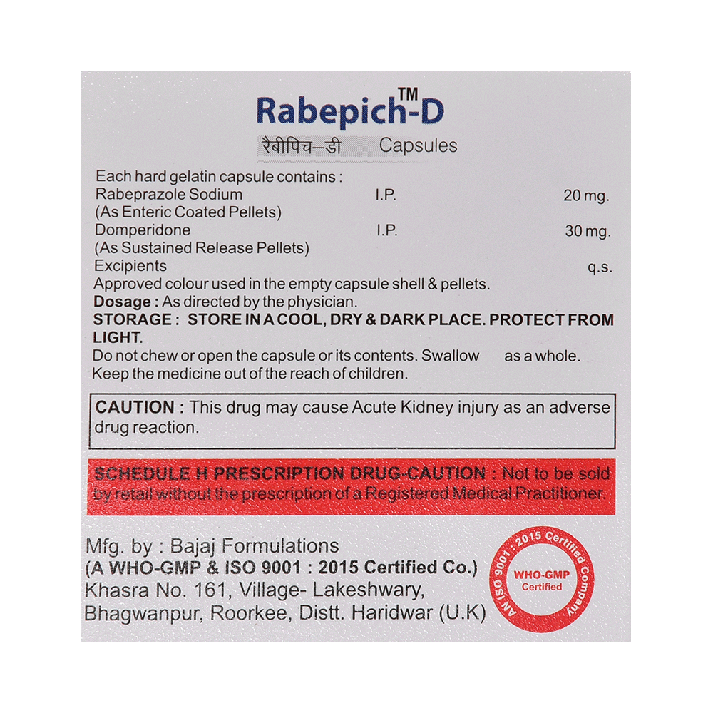 Rabepich-D Capsule SR is a combination medicine used to treat gastroesophageal reflux disease (acid reflux). It works by relieving the symptoms of acidity such as heartburn, stomach pain, or irritation. It also neutralizes the acid and promotes easy passage of gas to reduce stomach discomfort. Rabepich-D Capsule SR is taken without food in a dose and duration as advised by the doctor. The dose you are given will depend on your condition and how you respond to the medicine. You should keep taking this medicine for as long as your doctor recommends. If you stop treatment too early your symptoms may come back and your condition may worsen. Let your healthcare team know about all other medications you are taking as some may affect, or be affected by this medicine.The most common side effects are diarrhea, stomach pain, dryness in the mouth, headache, flatulence, and weakness. Most of these are temporary and usually resolve with time. Contact your doctor straight away if you are at all concerned about any of these side effects. This medicine may cause dizziness and sleepiness, so do not drive or do anything that requires mental focus until you know how this medicine affects you. Avoid drinking alcohol while taking this medicine as it can worsen your sleepiness. Lifestyle modifications like having cold milk and avoiding hot tea, coffee, spicy food or chocolate can help you to get better results.Before you start taking this medicine it is important to inform your doctor if you are suffering from kidney or liver disease. You should also tell your doctor if you are pregnant, planning pregnancy or breastfeeding.