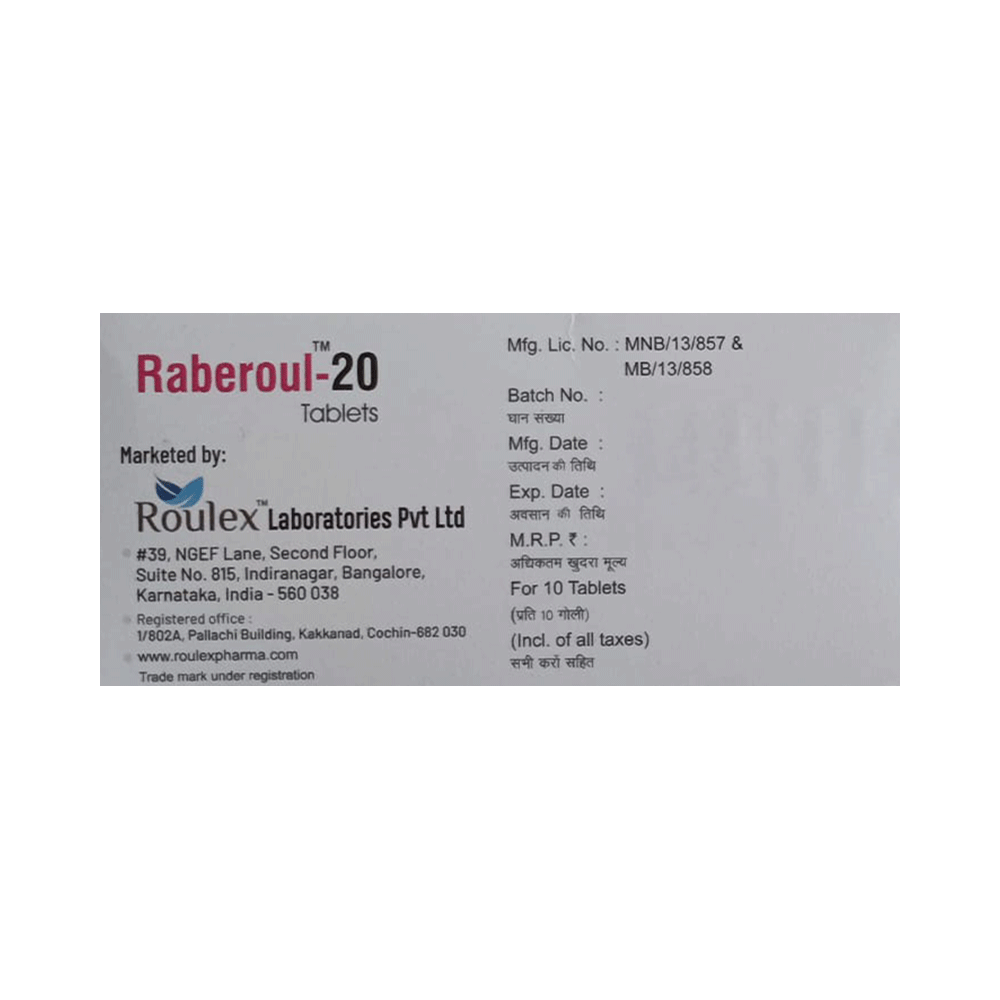 Raberoul 20 Tablet is a medicine that reduces the amount of acid produced in your stomach. It is used in the treatment of acid-related diseases of the stomach and intestine such as acid reflux, peptic ulcer disease, and Zollinger-Ellison syndrome. It provides relief from symptoms and promotes healing. Raberoul 20 Tablet medicine should be taken one hour before a meal, preferably in the morning. The dose will depend on your underlying condition and how you respond to the medicine. Try to take it regularly at the same time each day as advised by your doctor. You should keep on taking it as prescribed even if your symptoms disappear quickly. You may be able to help improve your symptoms by eating smaller meals more often and avoiding caffeinated drinks like tea and coffee, and spicy or fatty foods.This medicine's most common side effects include nausea, vomiting, headache, dizziness, flatulence, diarrhea, and stomach pain. These tend to be mild but talk to your doctor if they bother you or do not go away. The risk of side effects may increase the longer you take this medicine. Long-term use (more than 1 year) may increase your risk for bone fractures, especially with higher doses. Talk to your doctor about ways to prevent bone loss (osteoporosis), like taking calcium and vitamin D supplements.Low blood magnesium levels (hypomagnesemia) have been seen in some people taking this medicine for 3 months or more. This may lead to tiredness, confusion, dizziness, muscle twitches, and an irregular heartbeat. Your doctor may monitor your magnesium levels to prevent this.Raberoul 20 Tablet is not suitable for some people. Before taking this medicine, you need to tell your doctor if you have severe liver problems, are taking medicines for HIV, have ever had an allergic reaction to similar medicines in the past, or suffer from bone loss (osteoporosis). Pregnant or breastfeeding women should also consult their doctor before taking it. Avoid drinking alcohol as it makes your stomach produce excessive acid and can worsen your symptoms. Do not drive or use machinery or tools, if this medicine makes you feel dizzy or sleepy.