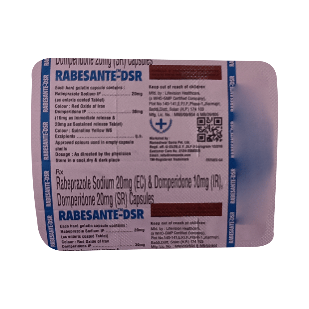 Rabesante-DSR Capsule is a combination medicine used to treat gastroesophageal reflux disease (acid reflux). It works by relieving the symptoms of acidity such as heartburn, stomach pain, or irritation. It also neutralizes the acid and promotes easy passage of gas to reduce stomach discomfort. Rabesante-DSR Capsule is taken without food in a dose and duration as advised by the doctor. The dose you are given will depend on your condition and how you respond to the medicine. You should keep taking this medicine for as long as your doctor recommends. If you stop treatment too early your symptoms may come back and your condition may worsen. Let your healthcare team know about all other medications you are taking as some may affect, or be affected by this medicine.The most common side effects are diarrhea, stomach pain, dryness in the mouth, headache, flatulence, and weakness. Most of these are temporary and usually resolve with time. Contact your doctor straight away if you are at all concerned about any of these side effects. This medicine may cause dizziness and sleepiness, so do not drive or do anything that requires mental focus until you know how this medicine affects you. Avoid drinking alcohol while taking this medicine as it can worsen your sleepiness. Lifestyle modifications like having cold milk and avoiding hot tea, coffee, spicy food or chocolate can help you to get better results.Before you start taking this medicine it is important to inform your doctor if you are suffering from kidney or liver disease. You should also tell your doctor if you are pregnant, planning pregnancy or breastfeeding.