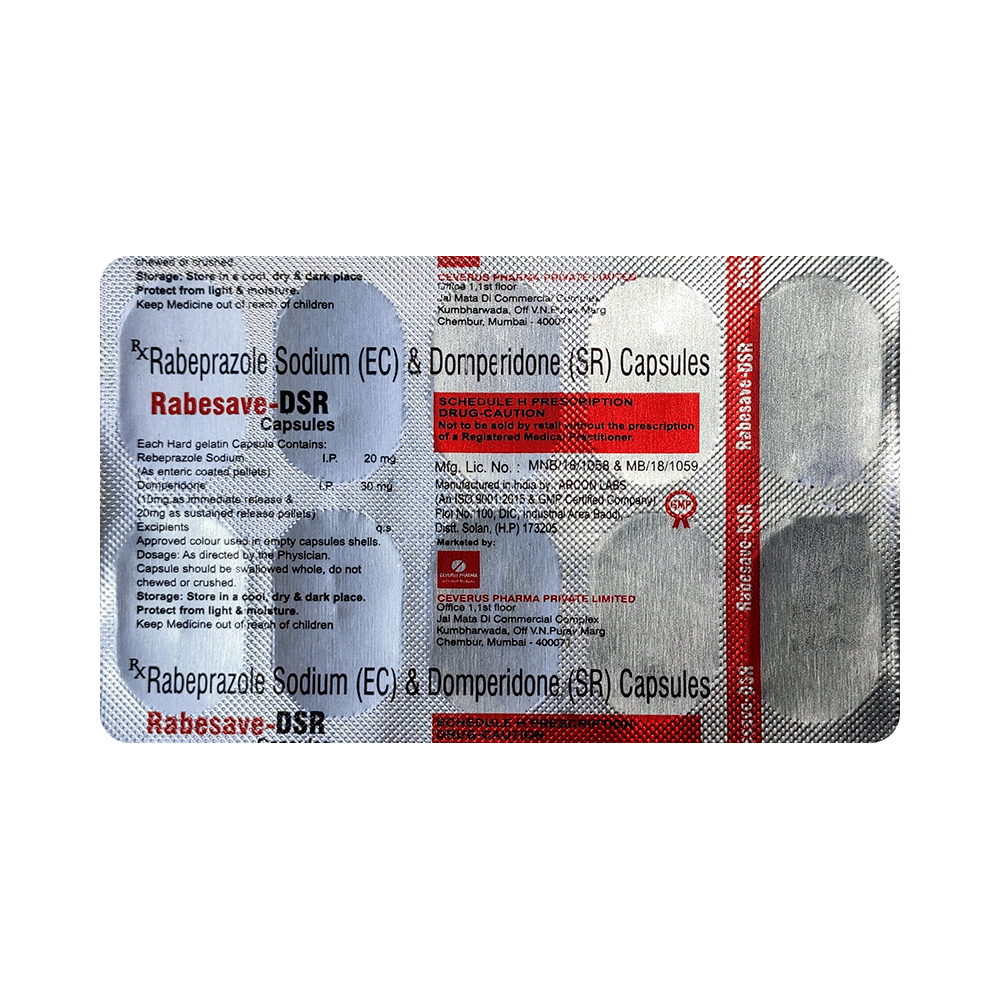Rabesave DSR Capsule is a combination medicine used to treat gastroesophageal reflux disease (acid reflux). It works by relieving the symptoms of acidity such as heartburn, stomach pain, or irritation. It also neutralizes the acid and promotes easy passage of gas to reduce stomach discomfort. Rabesave DSR Capsule is taken without food in a dose and duration as advised by the doctor. The dose you are given will depend on your condition and how you respond to the medicine. You should keep taking this medicine for as long as your doctor recommends. If you stop treatment too early your symptoms may come back and your condition may worsen. Let your healthcare team know about all other medications you are taking as some may affect, or be affected by this medicine.The most common side effects are diarrhea, stomach pain, dryness in the mouth, headache, flatulence, and weakness. Most of these are temporary and usually resolve with time. Contact your doctor straight away if you are at all concerned about any of these side effects. This medicine may cause dizziness and sleepiness, so do not drive or do anything that requires mental focus until you know how this medicine affects you. Avoid drinking alcohol while taking this medicine as it can worsen your sleepiness. Lifestyle modifications like having cold milk and avoiding hot tea, coffee, spicy food or chocolate can help you to get better results.Before you start taking this medicine it is important to inform your doctor if you are suffering from kidney or liver disease. You should also tell your doctor if you are pregnant, planning pregnancy or breastfeeding.