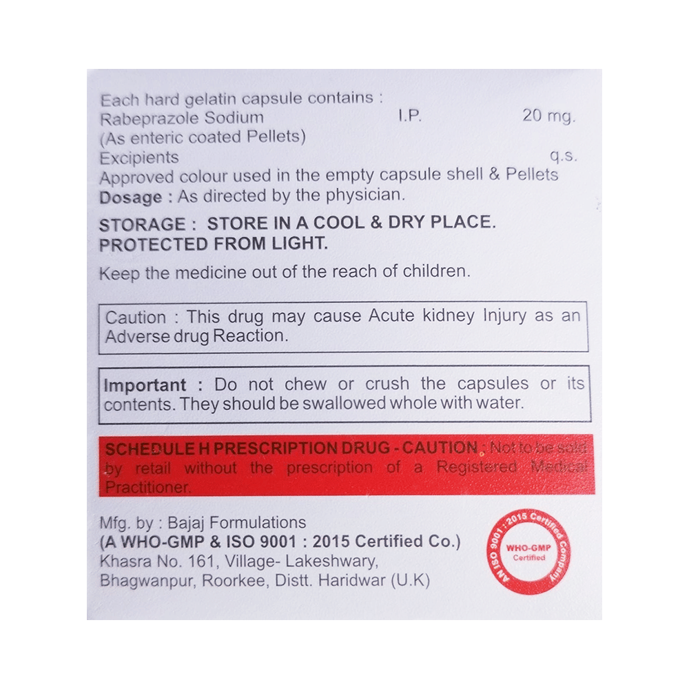 Rabesome 20 Capsule is a medicine that reduces the amount of acid produced in your stomach. It is used in the treatment of acid-related diseases of the stomach and intestine such as acid reflux, peptic ulcer disease, and Zollinger-Ellison syndrome. It provides relief from symptoms and promotes healing. Rabesome 20 Capsule medicine should be taken one hour before a meal, preferably in the morning. The dose will depend on your underlying condition and how you respond to the medicine. Try to take it regularly at the same time each day as advised by your doctor. You should keep on taking it as prescribed even if your symptoms disappear quickly. You may be able to help improve your symptoms by eating smaller meals more often and avoiding caffeinated drinks like tea and coffee, and spicy or fatty foods.This medicine's most common side effects include nausea, vomiting, headache, dizziness, flatulence, diarrhea, and stomach pain. These tend to be mild but talk to your doctor if they bother you or do not go away. The risk of side effects may increase the longer you take this medicine. Long-term use (more than 1 year) may increase your risk for bone fractures, especially with higher doses. Talk to your doctor about ways to prevent bone loss (osteoporosis), like taking calcium and vitamin D supplements.Low blood magnesium levels (hypomagnesemia) have been seen in some people taking this medicine for 3 months or more. This may lead to tiredness, confusion, dizziness, muscle twitches, and an irregular heartbeat. Your doctor may monitor your magnesium levels to prevent this.Rabesome 20 Capsule is not suitable for some people. Before taking this medicine, you need to tell your doctor if you have severe liver problems, are taking medicines for HIV, have ever had an allergic reaction to similar medicines in the past, or suffer from bone loss (osteoporosis). Pregnant or breastfeeding women should also consult their doctor before taking it. Avoid drinking alcohol as it makes your stomach produce excessive acid and can worsen your symptoms. Do not drive or use machinery or tools, if this medicine makes you feel dizzy or sleepy.