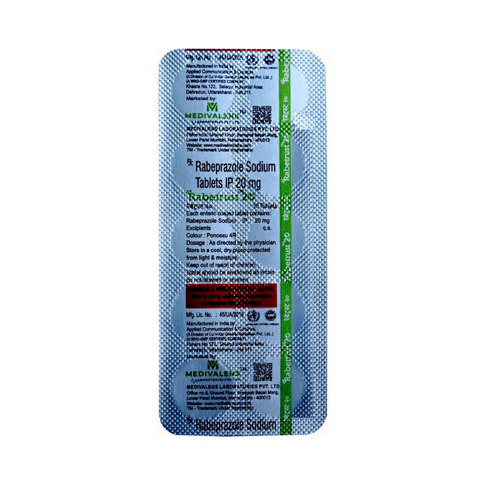 Rabetrust 20 Tablet is a medicine that reduces the amount of acid produced in your stomach. It is used in the treatment of acid-related diseases of the stomach and intestine such as acid reflux, peptic ulcer disease, and Zollinger-Ellison syndrome. It provides relief from symptoms and promotes healing. Rabetrust 20 Tablet medicine should be taken one hour before a meal, preferably in the morning. The dose will depend on your underlying condition and how you respond to the medicine. Try to take it regularly at the same time each day as advised by your doctor. You should keep on taking it as prescribed even if your symptoms disappear quickly. You may be able to help improve your symptoms by eating smaller meals more often and avoiding caffeinated drinks like tea and coffee, and spicy or fatty foods.This medicine's most common side effects include nausea, vomiting, headache, dizziness, flatulence, diarrhea, and stomach pain. These tend to be mild but talk to your doctor if they bother you or do not go away. The risk of side effects may increase the longer you take this medicine. Long-term use (more than 1 year) may increase your risk for bone fractures, especially with higher doses. Talk to your doctor about ways to prevent bone loss (osteoporosis), like taking calcium and vitamin D supplements.Low blood magnesium levels (hypomagnesemia) have been seen in some people taking this medicine for 3 months or more. This may lead to tiredness, confusion, dizziness, muscle twitches, and an irregular heartbeat. Your doctor may monitor your magnesium levels to prevent this.Rabetrust 20 Tablet is not suitable for some people. Before taking this medicine, you need to tell your doctor if you have severe liver problems, are taking medicines for HIV, have ever had an allergic reaction to similar medicines in the past, or suffer from bone loss (osteoporosis). Pregnant or breastfeeding women should also consult their doctor before taking it. Avoid drinking alcohol as it makes your stomach produce excessive acid and can worsen your symptoms. Do not drive or use machinery or tools, if this medicine makes you feel dizzy or sleepy.