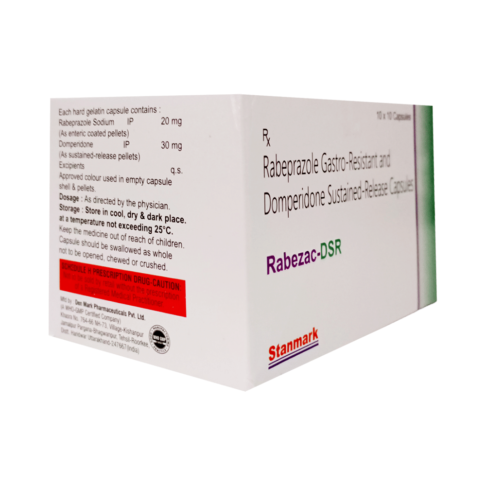 Rabezac-DSR Capsule is a combination medicine used to treat gastroesophageal reflux disease (acid reflux). It works by relieving the symptoms of acidity such as heartburn, stomach pain, or irritation. It also neutralizes the acid and promotes easy passage of gas to reduce stomach discomfort. Rabezac-DSR Capsule is taken without food in a dose and duration as advised by the doctor. The dose you are given will depend on your condition and how you respond to the medicine. You should keep taking this medicine for as long as your doctor recommends. If you stop treatment too early your symptoms may come back and your condition may worsen. Let your healthcare team know about all other medications you are taking as some may affect, or be affected by this medicine.The most common side effects are diarrhea, stomach pain, dryness in the mouth, headache, flatulence, and weakness. Most of these are temporary and usually resolve with time. Contact your doctor straight away if you are at all concerned about any of these side effects. This medicine may cause dizziness and sleepiness, so do not drive or do anything that requires mental focus until you know how this medicine affects you. Avoid drinking alcohol while taking this medicine as it can worsen your sleepiness. Lifestyle modifications like having cold milk and avoiding hot tea, coffee, spicy food or chocolate can help you to get better results.Before you start taking this medicine it is important to inform your doctor if you are suffering from kidney or liver disease. You should also tell your doctor if you are pregnant, planning pregnancy or breastfeeding.
