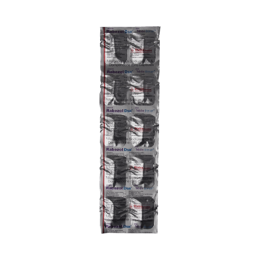 Rabezol DSR Capsule is a combination medicine used to treat gastroesophageal reflux disease (acid reflux). It works by relieving the symptoms of acidity such as heartburn, stomach pain, or irritation. It also neutralizes the acid and promotes easy passage of gas to reduce stomach discomfort. Rabezol DSR Capsule is taken without food in a dose and duration as advised by the doctor. The dose you are given will depend on your condition and how you respond to the medicine. You should keep taking this medicine for as long as your doctor recommends. If you stop treatment too early your symptoms may come back and your condition may worsen. Let your healthcare team know about all other medications you are taking as some may affect, or be affected by this medicine.The most common side effects are diarrhea, stomach pain, dryness in the mouth, headache, flatulence, and weakness. Most of these are temporary and usually resolve with time. Contact your doctor straight away if you are at all concerned about any of these side effects. This medicine may cause dizziness and sleepiness, so do not drive or do anything that requires mental focus until you know how this medicine affects you. Avoid drinking alcohol while taking this medicine as it can worsen your sleepiness. Lifestyle modifications like having cold milk and avoiding hot tea, coffee, spicy food or chocolate can help you to get better results.Before you start taking this medicine it is important to inform your doctor if you are suffering from kidney or liver disease. You should also tell your doctor if you are pregnant, planning pregnancy or breastfeeding.