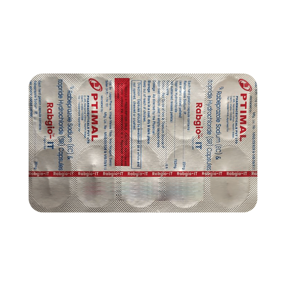 Rabgio-IT Capsule SR is a combination medicine used to treat gastroesophageal reflux disease (Acid reflux) and peptic ulcer disease by relieving the symptoms of acidity such as heartburn, stomach pain, or irritation. It also neutralizes the acid and promotes easy passage of gas to reduce stomach discomfort. Rabgio-IT Capsule SR is taken with or without food in a dose and duration as advised by the doctor. The dose you are given will depend on your condition and how you respond to the medicine. You should keep taking this medicine for as long as your doctor recommends. If you stop treatment too early your symptoms may come back and your condition may worsen. Let your healthcare team know about all other medications you are taking as some may affect, or be affected by this medicine.The most common side effects are stomach pain, diarrhea, constipation, headache, flatulence, weakness, and increased saliva production. Most of these are temporary and usually resolve with time. Contact your doctor straight away if you are at all concerned about any of these side effects. This medicine may cause dizziness and sleepiness, so do not drive or do anything that requires mental focus until you know how this medicine affects you. Avoid drinking alcohol while taking this medicine as it can worsen your sleepiness. Lifestyle modifications like having cold milk and avoiding hot tea, coffee, spicy food or chocolate can help you to get better results.Before you start taking this medicine it is important to inform your doctor if you are suffering from liver disease. You should also tell your doctor if you are pregnant, planning pregnancy or breastfeeding.