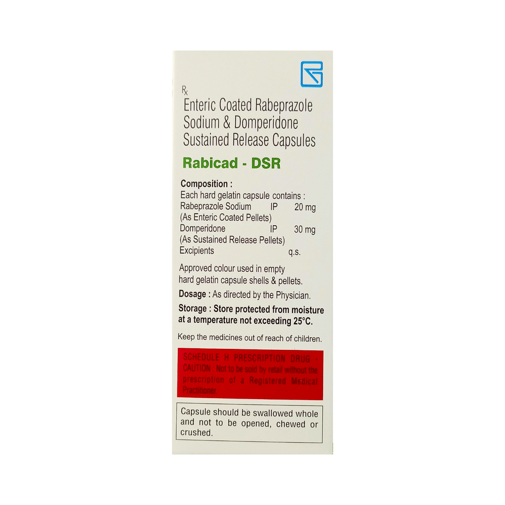 In Treatment of Gastroesophageal reflux disease (Acid reflux)Gastroesophageal reflux disease (GERD) is a chronic (long-term) condition in which there is an excess production of acid in the stomach. Rabicad-DSR Capsule reduces the amount of acid your stomach makes and relieves the pain associated with heartburn and acid reflux. You should take it exactly as it is prescribed for it to be effective. Some simple lifestyle changes can help reduce the symptoms of GERD. Think about what foods trigger heartburn and try to avoid them; eat smaller, more frequent meals; try to lose weight if you are overweight, and try to find ways to relax. Do not eat within 3-4 hours of going to bed.In Treatment of Peptic ulcer diseasePeptic ulcer disease is a condition in which painful sores or ulcers develop in the inner lining of the stomach or gut (intestine). Rabicad-DSR Capsule reduces the amount of acid your stomach makes which prevents further damage to the ulcer as it heals naturally. You may be given other medicines along with this medicine depending on what caused the ulcer. You need to keep taking the medicine as it is prescribed for it to be effective, even if the symptoms seem to disappear.show moreshow less