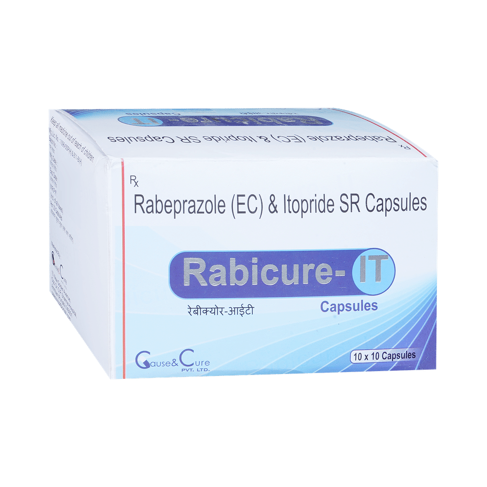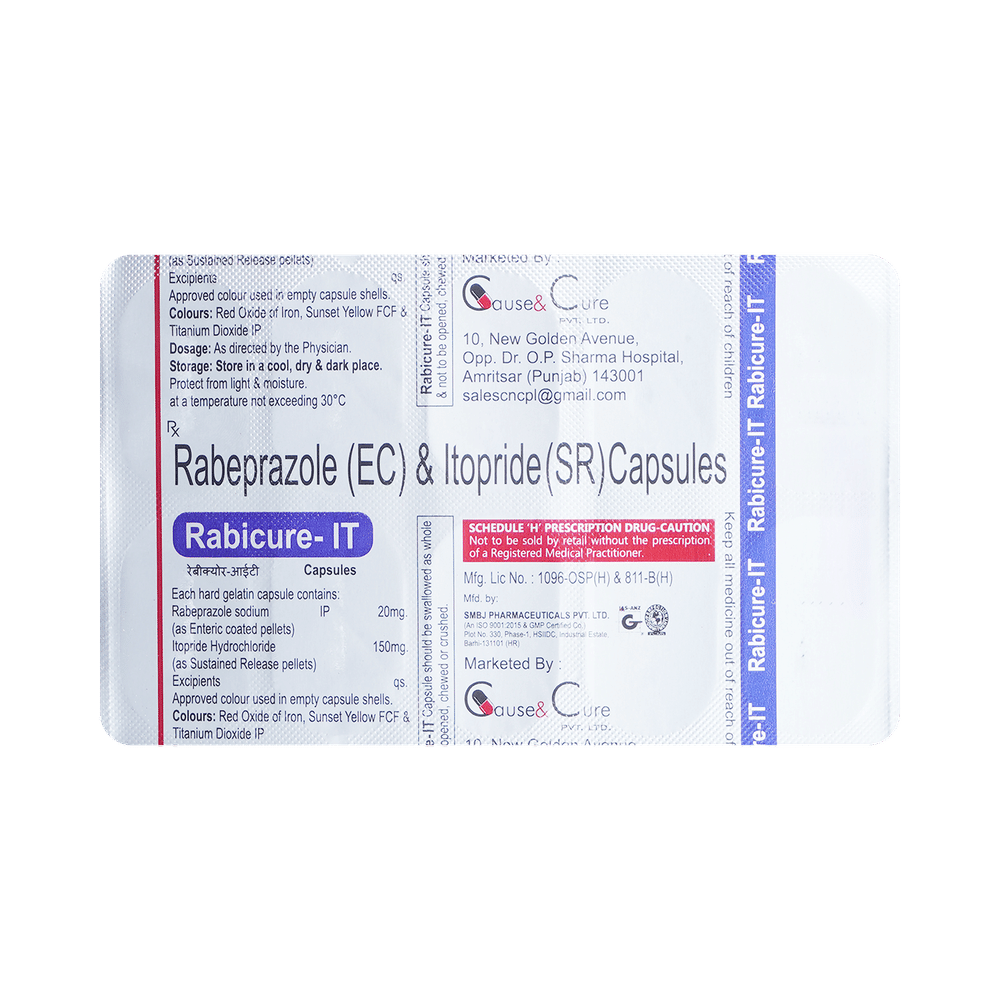 Rabicure IT 20mg/150mg Capsule is a combination of two medicines: Rabeprazole and Itopride. Rabeprazole is a proton pump inhibitor (PPI). It works by reducing the amount of acid in the stomach which helps in the relief of acid-related indigestion and heartburn. Itopride is a prokinetic which works on the region in the brain that controls vomiting. It also acts on the upper digestive tract to increase the movement of the stomach and intestines, allowing food to move more easily through the stomach.