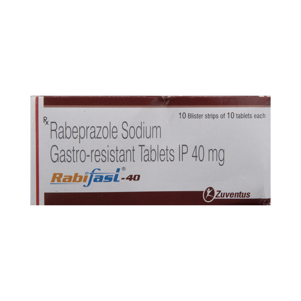 Rabifast 40 Tablet is a medicine that reduces the amount of acid produced in your stomach. It is used in the treatment of acid-related diseases of the stomach and intestine such as acid reflux, peptic ulcer disease, and Zollinger-Ellison syndrome. It provides relief from symptoms and promotes healing. Rabifast 40 Tablet medicine should be taken one hour before a meal, preferably in the morning. The dose will depend on your underlying condition and how you respond to the medicine. Try to take it regularly at the same time each day as advised by your doctor. You should keep on taking it as prescribed even if your symptoms disappear quickly. You may be able to help improve your symptoms by eating smaller meals more often and avoiding caffeinated drinks like tea and coffee, and spicy or fatty foods.This medicine's most common side effects include nausea, vomiting, headache, dizziness, flatulence, diarrhea, and stomach pain. These tend to be mild but talk to your doctor if they bother you or do not go away. The risk of side effects may increase the longer you take this medicine. Long-term use (more than 1 year) may increase your risk for bone fractures, especially with higher doses. Talk to your doctor about ways to prevent bone loss (osteoporosis), like taking calcium and vitamin D supplements.Low blood magnesium levels (hypomagnesemia) have been seen in some people taking this medicine for 3 months or more. This may lead to tiredness, confusion, dizziness, muscle twitches, and an irregular heartbeat. Your doctor may monitor your magnesium levels to prevent this.Rabifast 40 Tablet is not suitable for some people. Before taking this medicine, you need to tell your doctor if you have severe liver problems, are taking medicines for HIV, have ever had an allergic reaction to similar medicines in the past, or suffer from bone loss (osteoporosis). Pregnant or breastfeeding women should also consult their doctor before taking it. Avoid drinking alcohol as it makes your stomach produce excessive acid and can worsen your symptoms. Do not drive or use machinery or tools, if this medicine makes you feel dizzy or sleepy.
