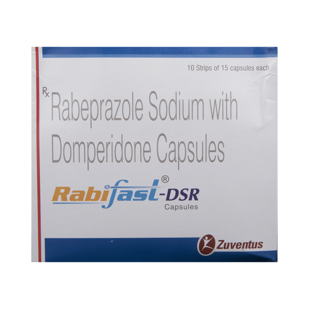 Rabifast-DSR Capsule is a combination of two medicines: Domperidone and Rabeprazole. Domperidone is a prokinetic that works on the upper digestive tract to increase the movement of the stomach and intestines, allowing the food to move more easily through the stomach. Rabeprazole is a proton pump inhibitor (PPI) which works by reducing the amount of acid in the stomach, which helps in the relief of acid-related indigestion and heartburn.