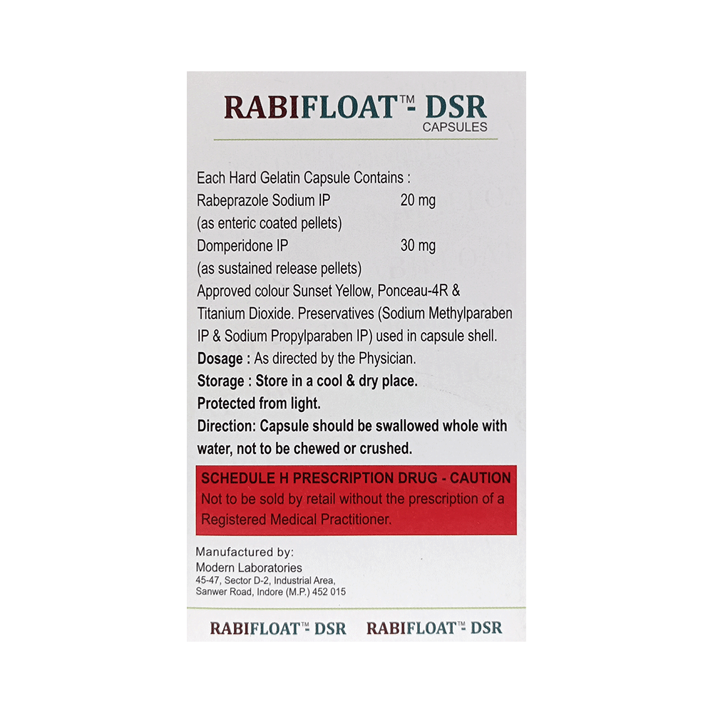 Rabifloat-DSR Capsule is a combination medicine used to treat gastroesophageal reflux disease (acid reflux). It works by relieving the symptoms of acidity such as heartburn, stomach pain, or irritation. It also neutralizes the acid and promotes easy passage of gas to reduce stomach discomfort. Rabifloat-DSR Capsule is taken without food in a dose and duration as advised by the doctor. The dose you are given will depend on your condition and how you respond to the medicine. You should keep taking this medicine for as long as your doctor recommends. If you stop treatment too early your symptoms may come back and your condition may worsen. Let your healthcare team know about all other medications you are taking as some may affect, or be affected by this medicine.The most common side effects are diarrhea, stomach pain, dryness in the mouth, headache, flatulence, and weakness. Most of these are temporary and usually resolve with time. Contact your doctor straight away if you are at all concerned about any of these side effects. This medicine may cause dizziness and sleepiness, so do not drive or do anything that requires mental focus until you know how this medicine affects you. Avoid drinking alcohol while taking this medicine as it can worsen your sleepiness. Lifestyle modifications like having cold milk and avoiding hot tea, coffee, spicy food or chocolate can help you to get better results.Before you start taking this medicine it is important to inform your doctor if you are suffering from kidney or liver disease. You should also tell your doctor if you are pregnant, planning pregnancy or breastfeeding.