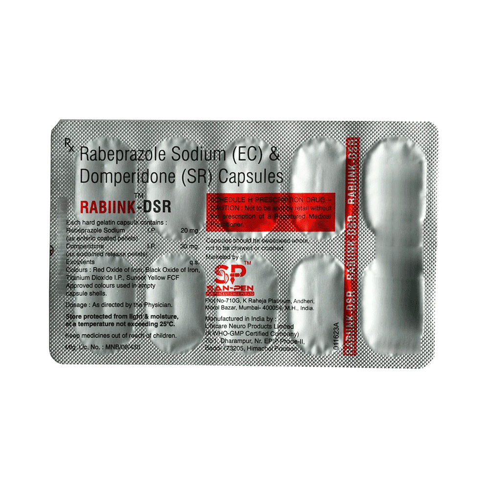 In Treatment of Gastroesophageal reflux disease (Acid reflux)Gastroesophageal reflux disease (GERD) is a chronic (long-term) condition in which there is an excess production of acid in the stomach. Rabiink-DSR Capsule reduces the amount of acid your stomach makes and relieves the pain associated with heartburn and acid reflux. You should take it exactly as it is prescribed for it to be effective. Some simple lifestyle changes can help reduce the symptoms of GERD. Think about what foods trigger heartburn and try to avoid them; eat smaller, more frequent meals; try to lose weight if you are overweight, and try to find ways to relax. Do not eat within 3-4 hours of going to bed.In Treatment of Peptic ulcer diseasePeptic ulcer disease is a condition in which painful sores or ulcers develop in the inner lining of the stomach or gut (intestine). Rabiink-DSR Capsule reduces the amount of acid your stomach makes which prevents further damage to the ulcer as it heals naturally. You may be given other medicines along with this medicine depending on what caused the ulcer. You need to keep taking the medicine as it is prescribed for it to be effective, even if the symptoms seem to disappear.show moreshow less