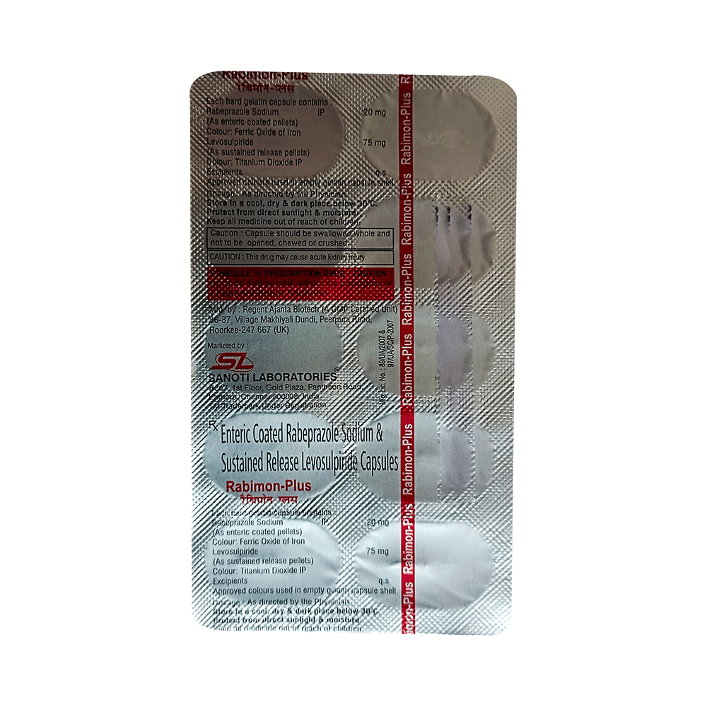 Rabimon-Plus Capsule SR is a prescription medicine which is used in the treatment of gastroesophageal reflux disease (acid reflux), intestinal ulcers, and irritable bowel syndrome. It reduces excess acid production in the stomach and prevents the reflux of stomach acid into the food pipe. Rabimon-Plus Capsule SR is taken with or without food in a dose and duration as advised by the doctor. The dose you are given will depend on your condition and how you respond to the medicine. You should keep taking this medicine for as long as your doctor recommends. If you stop treatment too early your symptoms may come back and your condition may worsen. Let your healthcare team know about all other medications you are taking as some may affect, or be affected by this medicine.The most common side effects are nausea, stomach pain, diarrhea, flatulence, constipation, headache, weakness, and flu-like symptoms. Most of these are temporary and usually resolve with time. Contact your doctor straight away if you are at all concerned about any of these side effects. It may also cause dizziness and sleepiness, so do not drive or do anything that requires mental focus until you know how this medicine affects you. Avoid drinking alcohol while taking this medicine as it can worsen your sleepiness.Lifestyle modifications like having fiber-rich diet, avoiding foods that trigger your symptoms, increasing fluid intake and regular exercise can help you to get better results. Before taking it, you should tell your doctor if you have any kidney or liver diseases. You should also tell your doctor if you are pregnant, planning pregnancy or breastfeeding.