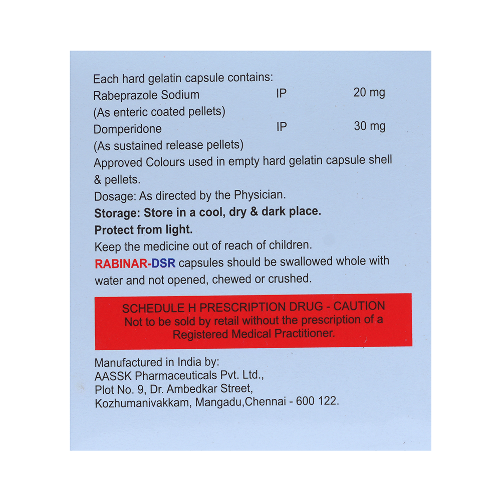 In Treatment of Gastroesophageal reflux disease (Acid reflux)Gastroesophageal reflux disease (GERD) is a chronic (long-term) condition in which there is an excess production of acid in the stomach. Rabinar-DSR Capsule reduces the amount of acid your stomach makes and relieves the pain associated with heartburn and acid reflux. You should take it exactly as it is prescribed for it to be effective. Some simple lifestyle changes can help reduce the symptoms of GERD. Think about what foods trigger heartburn and try to avoid them; eat smaller, more frequent meals; try to lose weight if you are overweight, and try to find ways to relax. Do not eat within 3-4 hours of going to bed.In Treatment of Peptic ulcer diseasePeptic ulcer disease is a condition in which painful sores or ulcers develop in the inner lining of the stomach or gut (intestine). Rabinar-DSR Capsule reduces the amount of acid your stomach makes which prevents further damage to the ulcer as it heals naturally. You may be given other medicines along with this medicine depending on what caused the ulcer. You need to keep taking the medicine as it is prescribed for it to be effective, even if the symptoms seem to disappear.show moreshow less