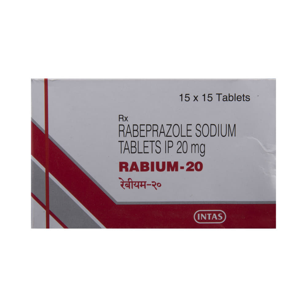 Rabium 20 Tablet is a medicine that reduces the amount of acid produced in your stomach. It is used in the treatment of acid-related diseases of the stomach and intestine such as acid reflux, peptic ulcer disease, and Zollinger-Ellison syndrome. It provides relief from symptoms and promotes healing. Rabium 20 Tablet medicine should be taken one hour before a meal, preferably in the morning. The dose will depend on your underlying condition and how you respond to the medicine. Try to take it regularly at the same time each day as advised by your doctor. You should keep on taking it as prescribed even if your symptoms disappear quickly. You may be able to help improve your symptoms by eating smaller meals more often and avoiding caffeinated drinks like tea and coffee, and spicy or fatty foods.This medicine's most common side effects include nausea, vomiting, headache, dizziness, flatulence, diarrhea, and stomach pain. These tend to be mild but talk to your doctor if they bother you or do not go away. The risk of side effects may increase the longer you take this medicine. Long-term use (more than 1 year) may increase your risk for bone fractures, especially with higher doses. Talk to your doctor about ways to prevent bone loss (osteoporosis), like taking calcium and vitamin D supplements.Low blood magnesium levels (hypomagnesemia) have been seen in some people taking this medicine for 3 months or more. This may lead to tiredness, confusion, dizziness, muscle twitches, and an irregular heartbeat. Your doctor may monitor your magnesium levels to prevent this.Rabium 20 Tablet is not suitable for some people. Before taking this medicine, you need to tell your doctor if you have severe liver problems, are taking medicines for HIV, have ever had an allergic reaction to similar medicines in the past, or suffer from bone loss (osteoporosis). Pregnant or breastfeeding women should also consult their doctor before taking it. Avoid drinking alcohol as it makes your stomach produce excessive acid and can worsen your symptoms. Do not drive or use machinery or tools, if this medicine makes you feel dizzy or sleepy.