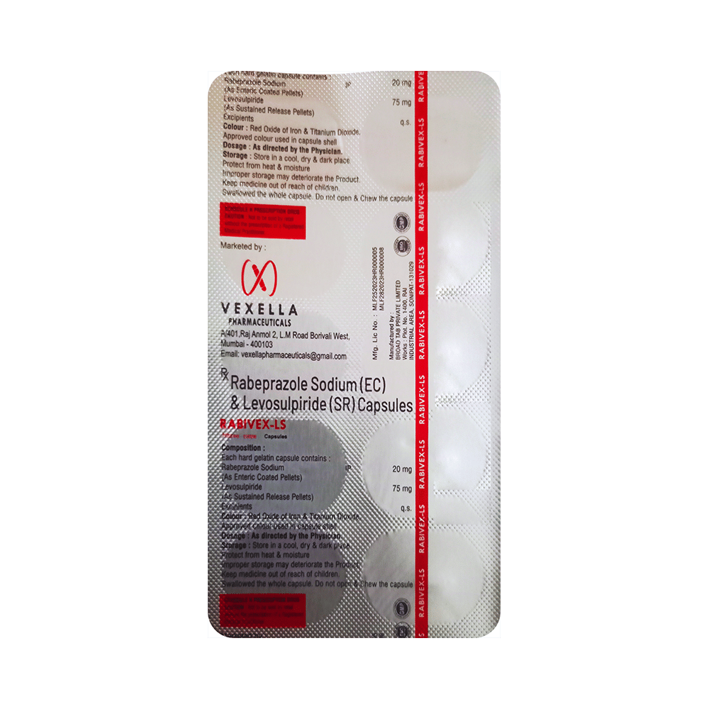 Rabivex-LS Capsule SR is a prescription medicine which is used in the treatment of gastroesophageal reflux disease (acid reflux), intestinal ulcers, and irritable bowel syndrome. It reduces excess acid production in the stomach and prevents the reflux of stomach acid into the food pipe. Rabivex-LS Capsule SR is taken with or without food in a dose and duration as advised by the doctor. The dose you are given will depend on your condition and how you respond to the medicine. You should keep taking this medicine for as long as your doctor recommends. If you stop treatment too early your symptoms may come back and your condition may worsen. Let your healthcare team know about all other medications you are taking as some may affect, or be affected by this medicine.The most common side effects are nausea, stomach pain, diarrhea, flatulence, constipation, headache, weakness, and flu-like symptoms. Most of these are temporary and usually resolve with time. Contact your doctor straight away if you are at all concerned about any of these side effects. It may also cause dizziness and sleepiness, so do not drive or do anything that requires mental focus until you know how this medicine affects you. Avoid drinking alcohol while taking this medicine as it can worsen your sleepiness.Lifestyle modifications like having fiber-rich diet, avoiding foods that trigger your symptoms, increasing fluid intake and regular exercise can help you to get better results. Before taking it, you should tell your doctor if you have any kidney or liver diseases. You should also tell your doctor if you are pregnant, planning pregnancy or breastfeeding.
