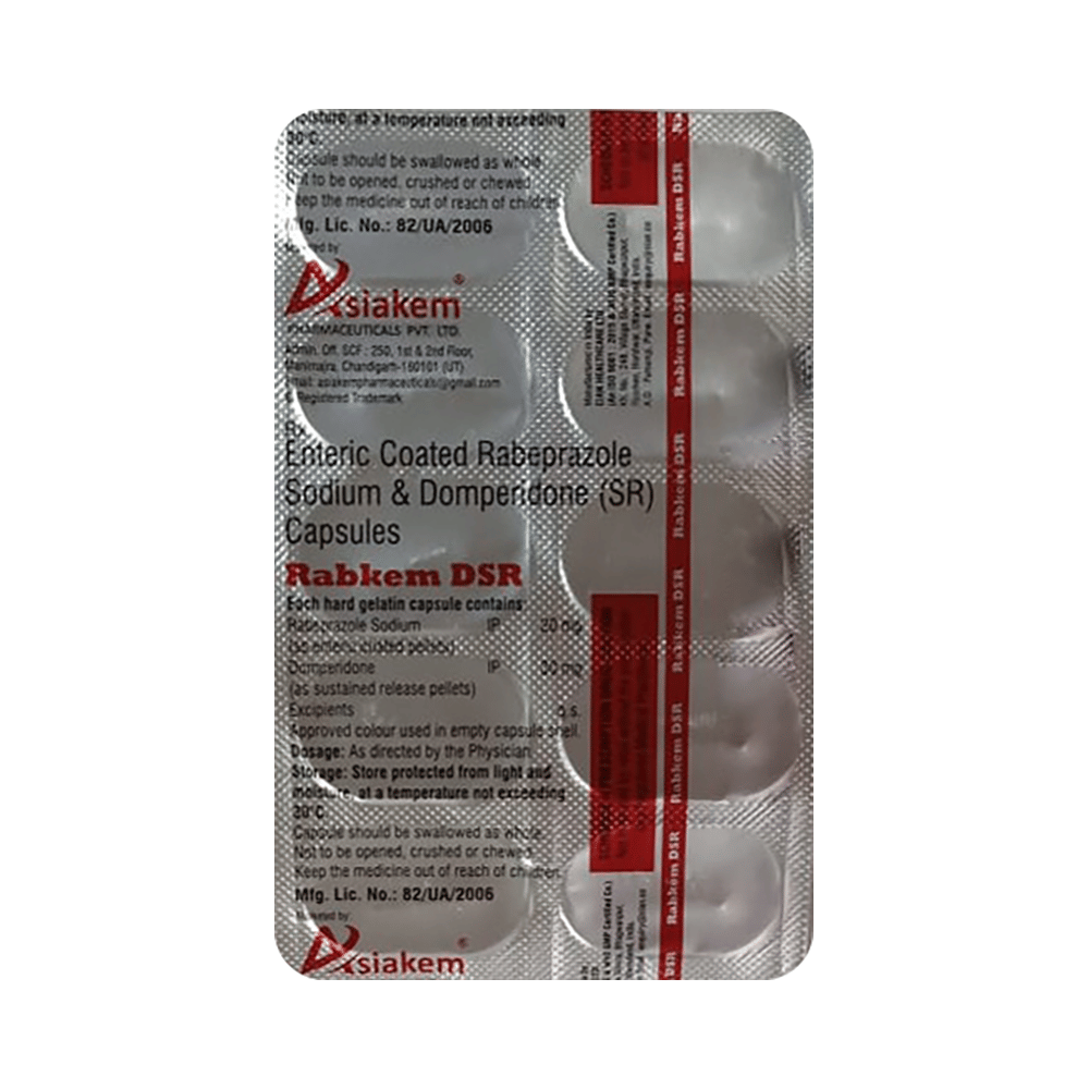 Rabkem DSR Capsule is a combination medicine used to treat gastroesophageal reflux disease (acid reflux). It works by relieving the symptoms of acidity such as heartburn, stomach pain, or irritation. It also neutralizes the acid and promotes easy passage of gas to reduce stomach discomfort. Rabkem DSR Capsule is taken without food in a dose and duration as advised by the doctor. The dose you are given will depend on your condition and how you respond to the medicine. You should keep taking this medicine for as long as your doctor recommends. If you stop treatment too early your symptoms may come back and your condition may worsen. Let your healthcare team know about all other medications you are taking as some may affect, or be affected by this medicine.The most common side effects are diarrhea, stomach pain, dryness in the mouth, headache, flatulence, and weakness. Most of these are temporary and usually resolve with time. Contact your doctor straight away if you are at all concerned about any of these side effects. This medicine may cause dizziness and sleepiness, so do not drive or do anything that requires mental focus until you know how this medicine affects you. Avoid drinking alcohol while taking this medicine as it can worsen your sleepiness. Lifestyle modifications like having cold milk and avoiding hot tea, coffee, spicy food or chocolate can help you to get better results.Before you start taking this medicine it is important to inform your doctor if you are suffering from kidney or liver disease. You should also tell your doctor if you are pregnant, planning pregnancy or breastfeeding.