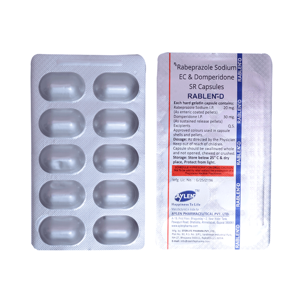 Rablen-D Capsule SR is a combination medicine used to treat gastroesophageal reflux disease (acid reflux). It works by relieving the symptoms of acidity such as heartburn, stomach pain, or irritation. It also neutralizes the acid and promotes easy passage of gas to reduce stomach discomfort. Rablen-D Capsule SR is taken without food in a dose and duration as advised by the doctor. The dose you are given will depend on your condition and how you respond to the medicine. You should keep taking this medicine for as long as your doctor recommends. If you stop treatment too early your symptoms may come back and your condition may worsen. Let your healthcare team know about all other medications you are taking as some may affect, or be affected by this medicine.The most common side effects are diarrhea, stomach pain, dryness in the mouth, headache, flatulence, and weakness. Most of these are temporary and usually resolve with time. Contact your doctor straight away if you are at all concerned about any of these side effects. This medicine may cause dizziness and sleepiness, so do not drive or do anything that requires mental focus until you know how this medicine affects you. Avoid drinking alcohol while taking this medicine as it can worsen your sleepiness. Lifestyle modifications like having cold milk and avoiding hot tea, coffee, spicy food or chocolate can help you to get better results.Before you start taking this medicine it is important to inform your doctor if you are suffering from kidney or liver disease. You should also tell your doctor if you are pregnant, planning pregnancy or breastfeeding.