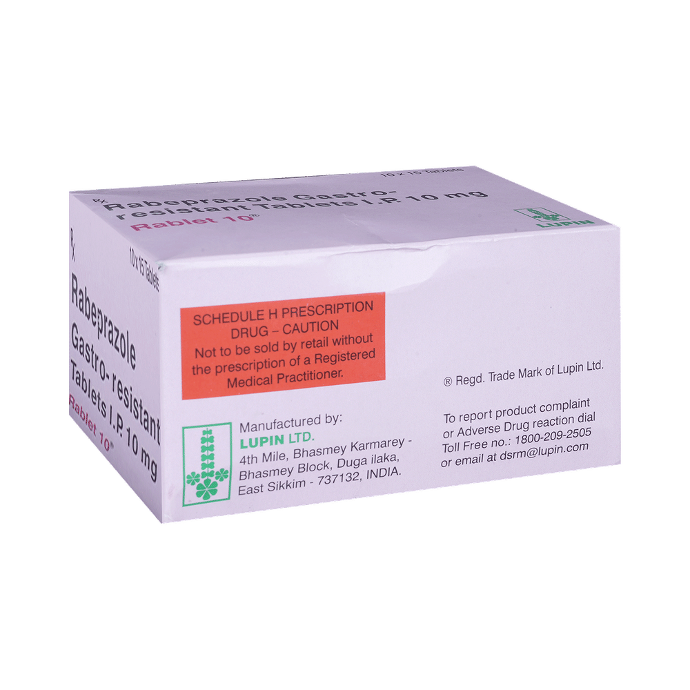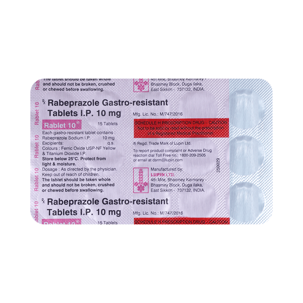 rABlet 10 Tablet is a medicine that reduces the amount of acid produced in your stomach. It is used in the treatment of acid-related diseases of the stomach and intestine such as acid reflux, peptic ulcer disease, and Zollinger-Ellison syndrome. It provides relief from symptoms and promotes healing. rABlet 10 Tablet medicine should be taken one hour before a meal, preferably in the morning. The dose will depend on your underlying condition and how you respond to the medicine. Try to take it regularly at the same time each day as advised by your doctor. You should keep on taking it as prescribed even if your symptoms disappear quickly. You may be able to help improve your symptoms by eating smaller meals more often and avoiding caffeinated drinks like tea and coffee, and spicy or fatty foods.This medicine's most common side effects include nausea, vomiting, headache, dizziness, flatulence, diarrhea, and stomach pain. These tend to be mild but talk to your doctor if they bother you or do not go away. The risk of side effects may increase the longer you take this medicine. Long-term use (more than 1 year) may increase your risk for bone fractures, especially with higher doses. Talk to your doctor about ways to prevent bone loss (osteoporosis), like taking calcium and vitamin D supplements.Low blood magnesium levels (hypomagnesemia) have been seen in some people taking this medicine for 3 months or more. This may lead to tiredness, confusion, dizziness, muscle twitches, and an irregular heartbeat. Your doctor may monitor your magnesium levels to prevent this.rABlet 10 Tablet is not suitable for some people. Before taking this medicine, you need to tell your doctor if you have severe liver problems, are taking medicines for HIV, have ever had an allergic reaction to similar medicines in the past, or suffer from bone loss (osteoporosis). Pregnant or breastfeeding women should also consult their doctor before taking it. Avoid drinking alcohol as it makes your stomach produce excessive acid and can worsen your symptoms. Do not drive or use machinery or tools, if this medicine makes you feel dizzy or sleepy.