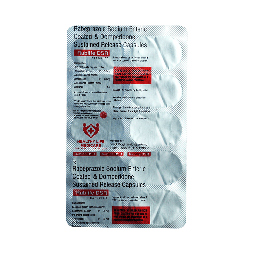 Rablife DSR Capsule is a combination of two medicines: Domperidone and Rabeprazole. Domperidone is a prokinetic that works on the upper digestive tract to increase the movement of the stomach and intestines, allowing the food to move more easily through the stomach. Rabeprazole is a proton pump inhibitor (PPI) which works by reducing the amount of acid in the stomach, which helps in the relief of acid-related indigestion and heartburn.