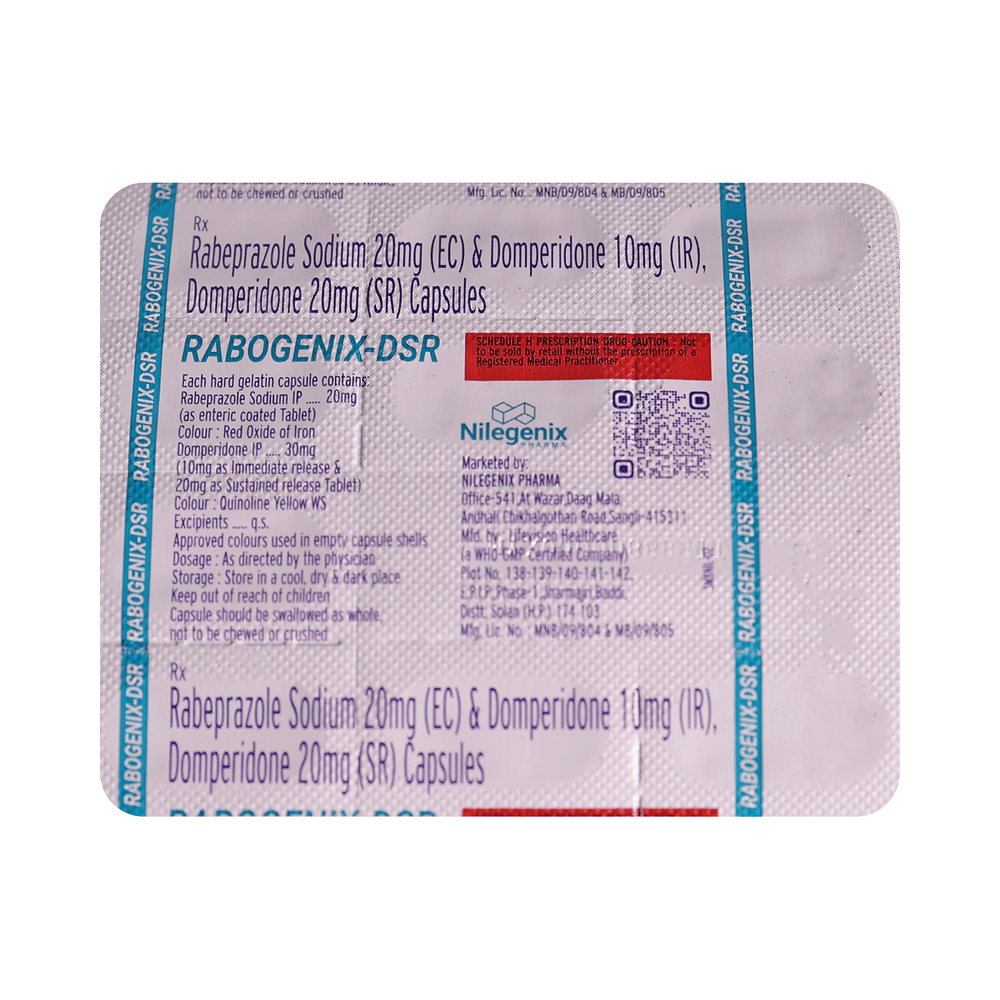 In Treatment of Gastroesophageal reflux disease (Acid reflux)Gastroesophageal reflux disease (GERD) is a chronic (long-term) condition in which there is an excess production of acid in the stomach. Rabogenix-DSR Capsule reduces the amount of acid your stomach makes and relieves the pain associated with heartburn and acid reflux. You should take it exactly as it is prescribed for it to be effective. Some simple lifestyle changes can help reduce the symptoms of GERD. Think about what foods trigger heartburn and try to avoid them; eat smaller, more frequent meals; try to lose weight if you are overweight, and try to find ways to relax. Do not eat within 3-4 hours of going to bed.In Treatment of Peptic ulcer diseasePeptic ulcer disease is a condition in which painful sores or ulcers develop in the inner lining of the stomach or gut (intestine). Rabogenix-DSR Capsule reduces the amount of acid your stomach makes which prevents further damage to the ulcer as it heals naturally. You may be given other medicines along with this medicine depending on what caused the ulcer. You need to keep taking the medicine as it is prescribed for it to be effective, even if the symptoms seem to disappear.show moreshow less