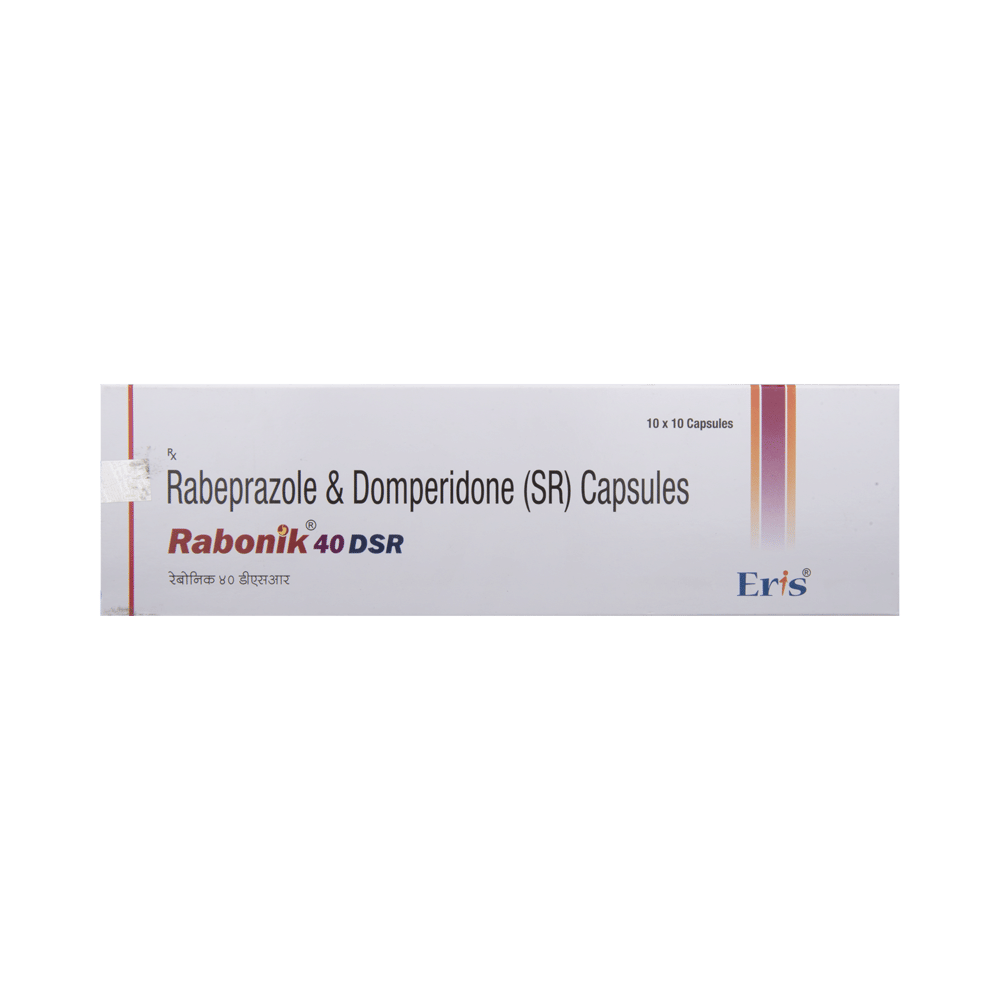 Rabonik 40 DSR Capsule is a combination medicine used to treat gastroesophageal reflux disease (acid reflux). It works by relieving the symptoms of acidity such as heartburn, stomach pain, or irritation. It also neutralizes the acid and promotes easy passage of gas to reduce stomach discomfort. Rabonik 40 DSR Capsule is taken without food in a dose and duration as advised by the doctor. The dose you are given will depend on your condition and how you respond to the medicine. You should keep taking this medicine for as long as your doctor recommends. If you stop treatment too early your symptoms may come back and your condition may worsen. Let your healthcare team know about all other medications you are taking as some may affect, or be affected by this medicine.The most common side effects are diarrhea, stomach pain, dryness in the mouth, headache, flatulence, and weakness. Most of these are temporary and usually resolve with time. Contact your doctor straight away if you are at all concerned about any of these side effects. This medicine may cause dizziness and sleepiness, so do not drive or do anything that requires mental focus until you know how this medicine affects you. Avoid drinking alcohol while taking this medicine as it can worsen your sleepiness. Lifestyle modifications like having cold milk and avoiding hot tea, coffee, spicy food or chocolate can help you to get better results.Before you start taking this medicine it is important to inform your doctor if you are suffering from kidney or liver disease. You should also tell your doctor if you are pregnant, planning pregnancy or breastfeeding.