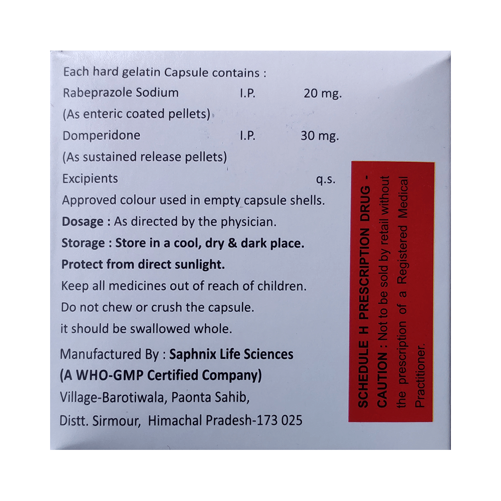 Salt Composition: Domperidone (30mg) + Rabeprazole (20mg)